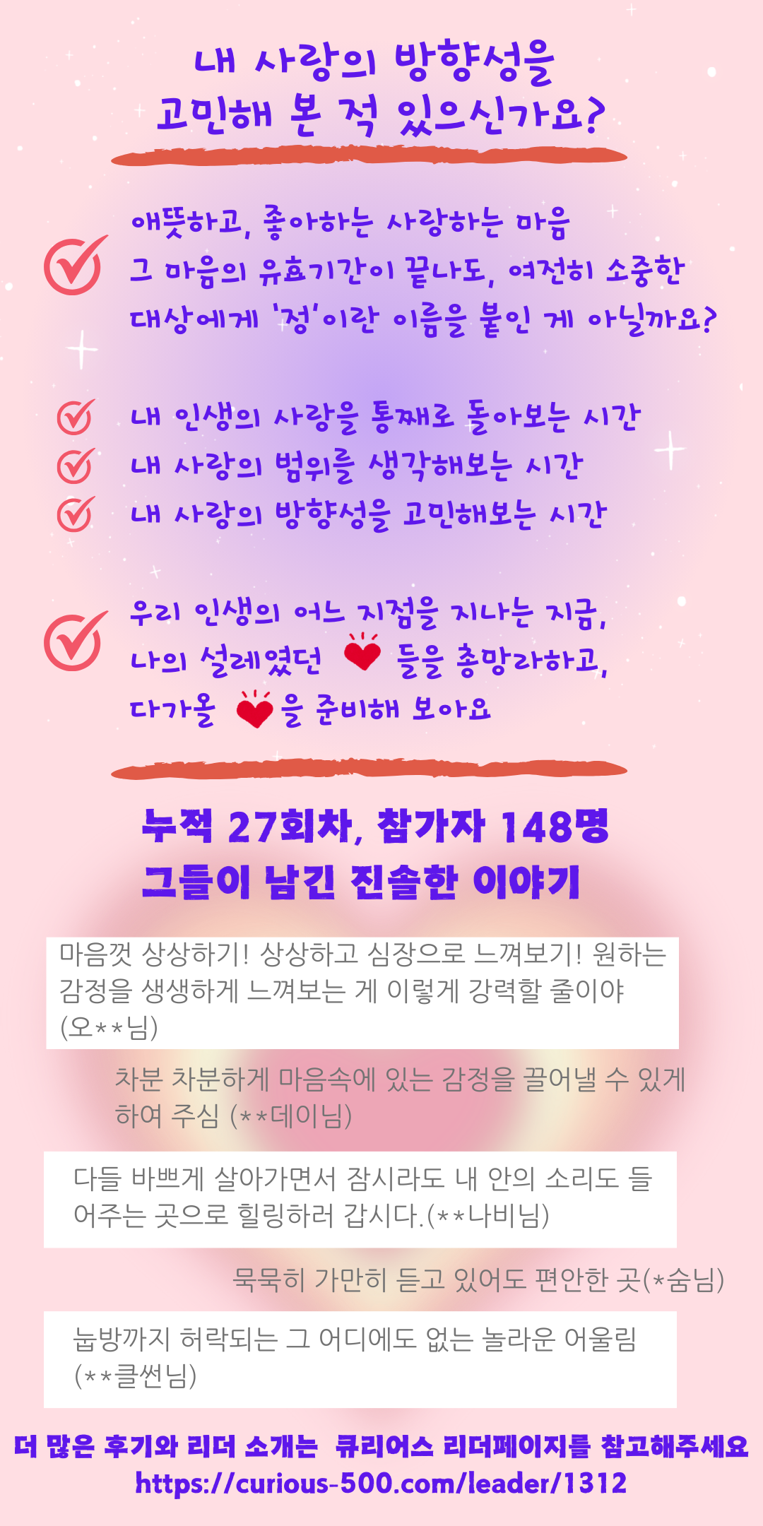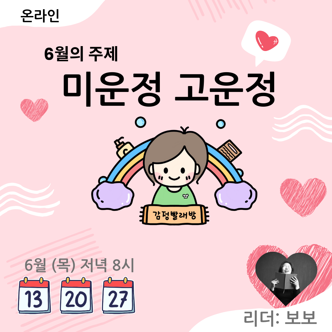 우리는 바쁘다는 이유로 나를 돌아보는 시간을 미루며 살곤 합니다. 나 자신과 멀어지는 느낌, 내가 진정 원하는 게 무엇인지 아리송한 느낌이 들 때, 그 때가 감정빨래방이 필요한 순간이예요. 풀지 못한 감정이 쌓여 후회할 미래를 만들기 전에, 정기적으로 내 마음을 들여다보고, 나를 보듬어주는 시간을 마련해봅니다. 나를 있는 그대로 받아주고, 내가 내 편이 될 수 있도록 마음을 열어보는 시간. 나에 대한 이해가 깊어질수록 내 가족과 주변 사람들에 대한 이해도 깊어집니다~