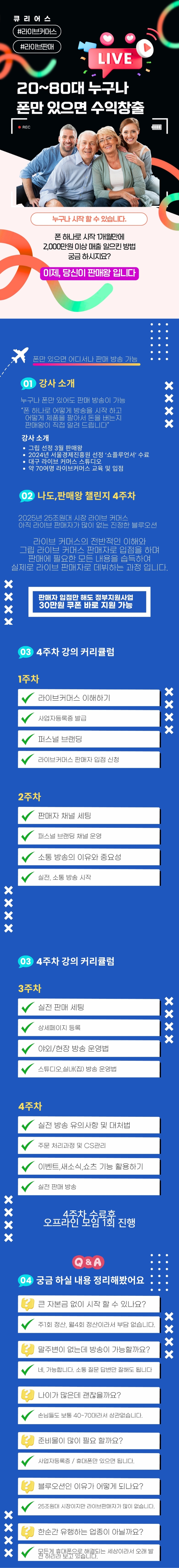 ✔ 그립 라이브커머스 3월 판매왕이 하나부터 열까지 알려주는 실전 내용 특히, 30대~80대까지 누구나 판매자 입점이 가능하고, 주 고객층이 대부분 30~50대 연령대라서 즐겁게 소통을 하며 판매 접근이 가능합니다. 2025년 약 25조원대 시장규모 형성하는 라이브커머스?! 국내 시장 규모가 엄청 커지고 있지만, 직접 방송 해야된다는 부담감에 판매자 입점이 거의 이뤄지지 않고 있습니다. 우리가 살아 가면서 혹은 살아 오면서 경험 하기 힘든 '블루오션'의 순간을 경험하고 놓치고 싶지 않으신 분들은 꼭 참여 해보시길 바랍니다. 강사소개 2024년 3월 그립선정 '신인판매왕' 현재도 판매 방송 진행중 2024년 서울경제진흥원 주관 '쇼플루언서' 3기 수료 2024년 8월 동대구 신세계 백화점 맞은편 'QB 라이브 커머스 스튜디오' 오픈 Q) 돈 없이 창업해서 돈 벌 수 있는 아이템이 존재 할까요? 네! 라이브커머스는 자부담금 없이 시작하여 수익 창출이 가능 합니다. 제가 활동 중인 라이브커머스 플랫폼은 그립(Grip) 이며, 주1회/월4회 정산이 이뤄 지기 때문에 정산 금액으로 충분히 구매 대금을 충당 가능 합니다. Q) 저는 말주변이 없고 나이도 많고 자신이 없는데 가능 할까요? 네 ! 가능합니다. 실제로 60~70대 라이브 커머스 판매자 분들도 많이 계시며 라이브 커머스는 '소통'이 핵심 입니다. 저희가 연예인이 될 필요가 없으며 라이브에 들어오시는 한분 한분과 따뜻한 소통을 이어 나가면 팔로우와 판매가 이어지는 놀라운 세계 입니다. Q) 준비물이 어떻게 될까요? 사업자등록증과 통신판매업 그리고 휴대폰만 있으면 3일내 판매 채널과 방송이 시작 됩니다. Q) 지금 라이브커머스를 도전 해야되는 필수 이유를 말해주세요 2025년 라이브커머스 시장을 25조원대 시장으로 리서치센터에서 보고 있습니다. 시장은 크나 라이브커머스 판매자는 그만큼 많지 않습니다. 그리고 소상공인공단/중소기업청에서 새로운 사업인 라이브커머스 지원금이 엄청 많이 있지만, 혜택을 보는 판매자도 많지 않습니다. 판매자 입점만 하여도 높은 확률로 소상공인공단/중소기업청과 연계한 국가 사업 30만원 쿠폰등 바로 지원을 받으 실 수 있습니다. Q ) 한순간 유행하는 업종은 아닐까요? 라이브 커머스가 단기간에 25조원대 시장을 형성한 가장 큰 이유는 생활에 스며 들었기 때문인것 같습니다. 글과 책보다는 동영상을 TV 보다는 모바일을 남녀노소 모두 이용하고있으며 모든 문화와 컨텐츠 소비가 모바일로 넘어 왔고 앞으로도 계속 이어 질것입니다. 앞으로도 유망한 사업이며, 지금 바로 도전해서 '블루오션'을 꼭 경험해보시고 새로운 삶의 활력을 얻어 보시길 바랍니다.😀