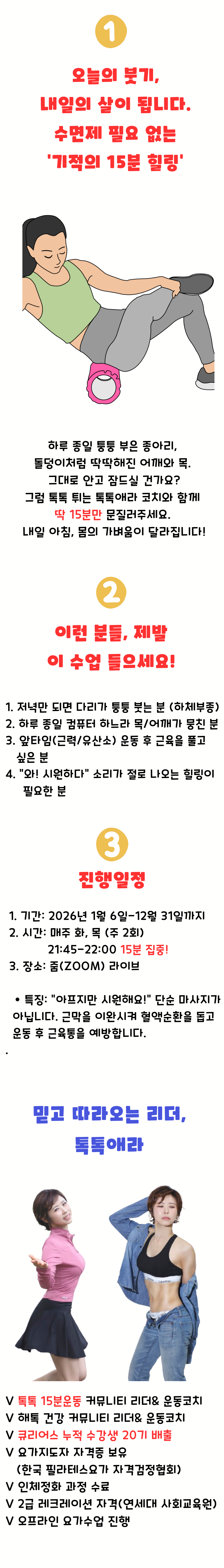 오늘의 붓기, 내일의 살이 됩니다! 수면제 필요 없는 '기적의 15분 폼롤러' 🌙 "오늘 하루도 고생한 내 몸에게 주는 선물 같은 시간" 15분 운동 강사 톡톡애라입니다. 열심히 운동하는 것만큼, 잘 풀어주는 것이 중요하다는 사실 알고 계셨나요? 하루 종일 퉁퉁 부은 종아리, 돌덩이처럼 딱딱해진 어깨와 목. 그대로 안고 주무시면 그게 다 **'미운 살'**이 되고 **'만성 통증'**이 됩니다. 잠들기 전 딱 15분! 저와 함께 몸 구석구석을 시원하게 문질러주세요. 내일 아침, 몸의 가벼움이 달라집니다! 🧘♀️ 왜 '톡톡애라 폼롤러'인가요? 1. 전문적인 근막 이완: 단순한 마사지가 아닙니다. 해부학적 지식을 바탕으로 가장 시원한 포인트를 찾아 뚫어드립니다. 2. 붓기 순삭: 꽉 막힌 림프를 순환시켜, 코끼리 다리를 사슴 다리로 만들어 드려요. 3. 꿀잠 보장: 몸이 이완되면 잠이 스르르 쏟아집니다. (불면증 있으신 분들 강추!) 4. 완벽한 마무리: 앞타임(근력/유산소) 운동 하신 분들에게는 필수 코스! (근육통 예방) 📅 진행 일정 (2025년 12월) 1. 기간: 2025년 12월 1일(월) ~ 12월 29일(월) [총 4주] 2. 시간: 매주 월요일 / 금요일 밤 9:45 ~ 10:00 (하루의 마무리! 씻고 주무시기 직전 가장 편안한 시간) 3. 장소: 온라인 줌(ZOOM) 라이브 준비물: 폼롤러, 매트 🙆♀️ 이런 분들, 제발 이 수업 들으세요! 1. 저녁만 되면 다리가 퉁퉁 붓는 분 (하체 부종) 2. 하루 종일 컴퓨터 하느라 목/어깨가 뭉친 직장인 3. "으어~ 시원하다" 소리가 절로 나오는 힐링이 필요한 분 4. 근력/유산소 운동 후 근육을 부드럽게 풀고 싶은 분 👩🏫 믿고 따라오는 리더, 톡톡애라