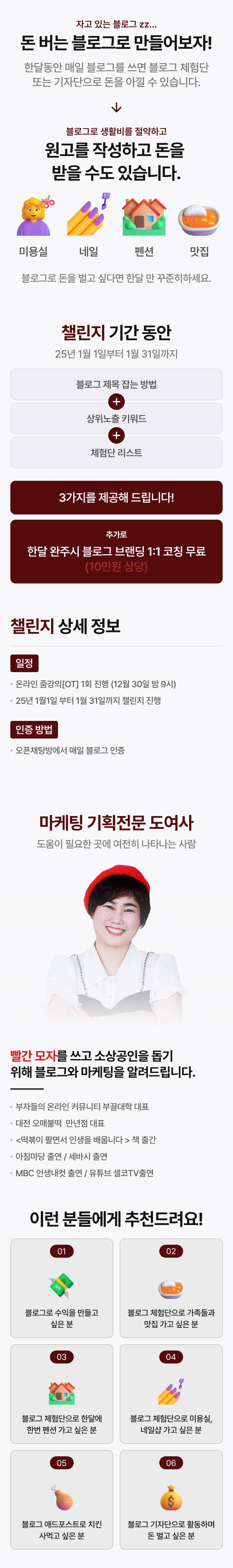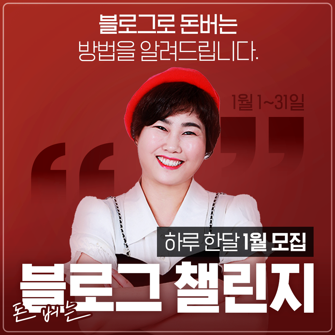 자고 있는 블로그 돈 버는 블로그로 만들어보자 한달동안 매일 블로그를 쓰면 블로그 체험단 또는 기자단으로 돈을 아낄 수 있습니다. 미용실, 네일, 속눈썹, 펜션, 맛집등 생활비를 절약하고 원고를 작성하고 돈을 받을 수도 있습니다. 블로그로 돈을 벌고 싶다면 한달 만 꾸준히하세요. 챌린지 기간동안 블로그 제목 잡는 방법, 상위노출 키워드, 체험단 리스트를 제공합니다. 기간 1월 1일 부터 1월 31일까지 돈버는 블로그 온라인 줌강의 1회 (12월 31일 밤 9시) 오픈채팅방에서 매일 블로그 인증 한달 완주시 블로그 브랜딩 1:1 코칭 무료 (10만원 상당)