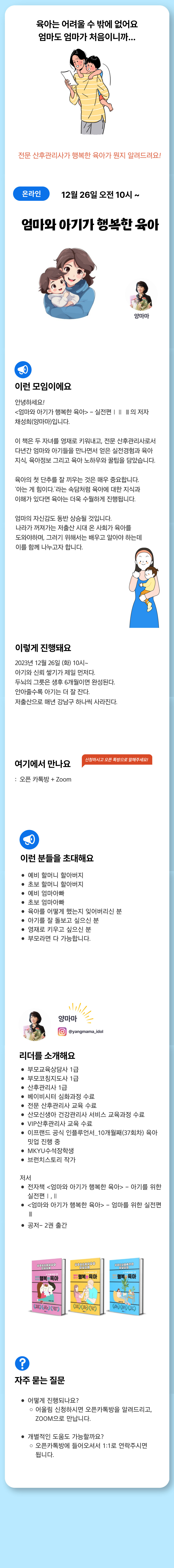 안녕하세요! <엄마와 아기가 행복한 육아> - 실전편ⅠⅡ Ⅲ의 저자 채성희(양마마)입니다. 이 책은 두 자녀를 영재로 키워내고, 전문 산후관리사로서 다년간 엄마와 아기들을 만나면서 얻은 실전경험과 육아지식, 육아정보 그리고 육아 노하우와 꿀팁을 담았습니다. 육아의 첫 단추를 잘 끼우는 것은 매우 중요합니다. ‘아는 게 힘이다.’라는 속담처럼 육아에 대한 지식과 이해가 있다면 육아는 더욱 수월하게 진행됩니다. 엄마의 자신감도 동반 상승될 것입니다. 나라가 꺼져가는 저출산 시대 온 사회가 육아를 도와야하며, 그러기 위해서는 배우고 알아야 하는데 이를 함께 나누고자 합니다.