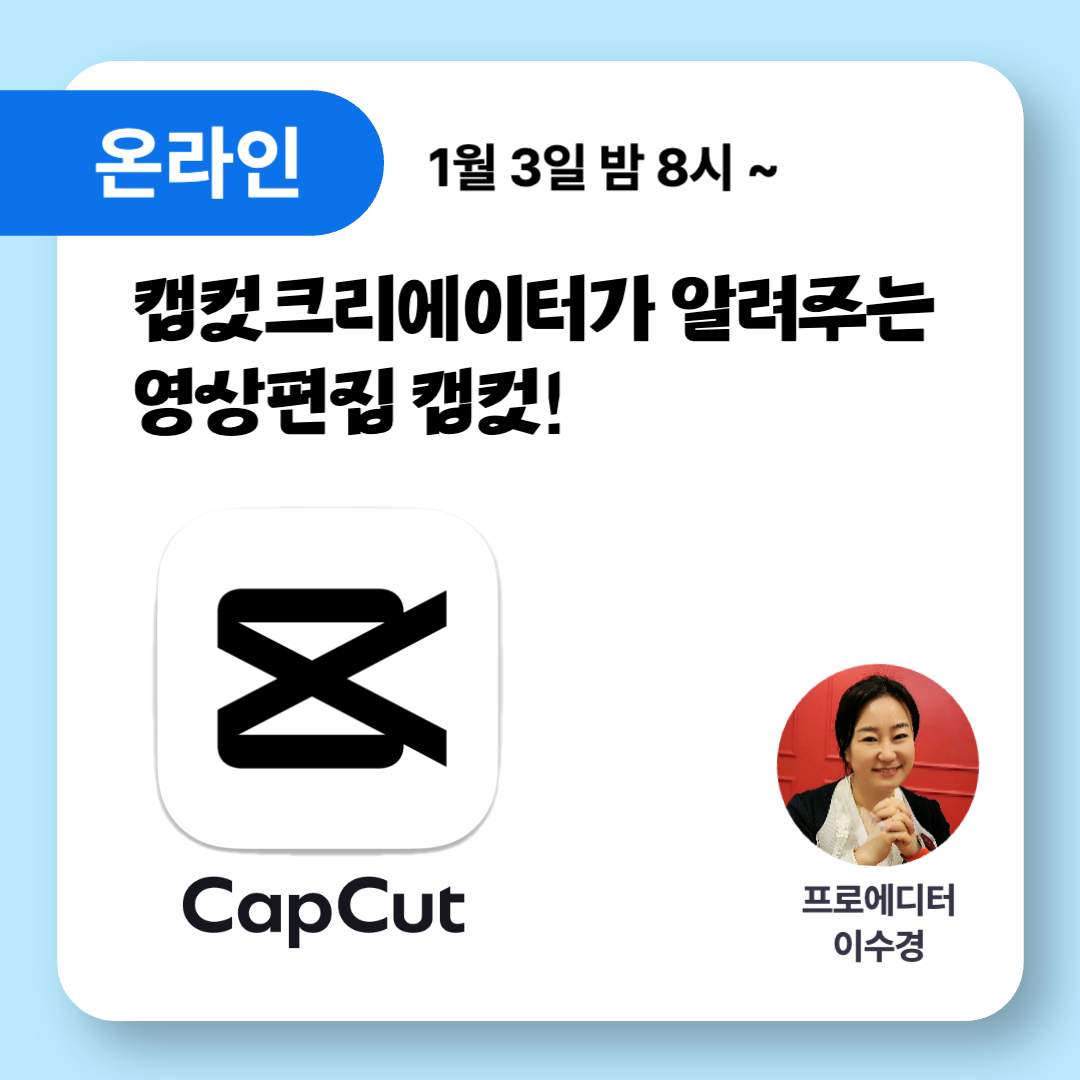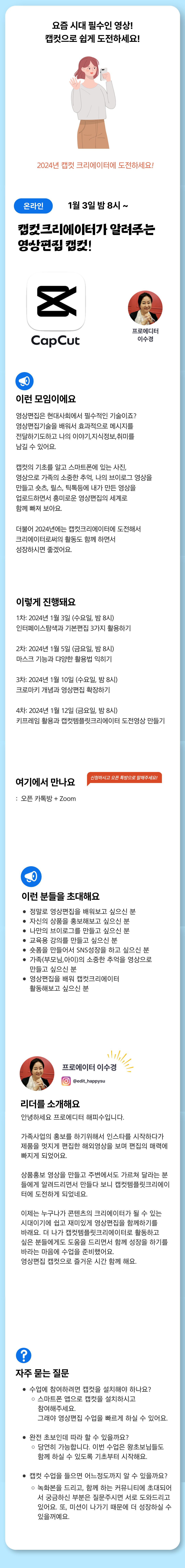 영상편집은 현대사회에서 필수적인 기술이죠? 영상편집기술을 배워서 효과적으로 메시지를 전달하기도하고 나의 이야기,지식정보,취미를 남길 수 있어요. 캡컷의 기초를 알고 스마트폰에 있는 사진, 영상으로 가족의 소중한 추억, 나의 브이로그 영상을 만들고 숏츠, 릴스, 틱톡등에 내가 만든 영상을 업로드하면서 흥미로운 영상편집의 세계로 함께 빠져 보아요. 더불어 2024년에는 캡컷크리에이터에 도전해서 크리에이터로써의 활동도 함께 하면서 성장하시면 좋겠어요.