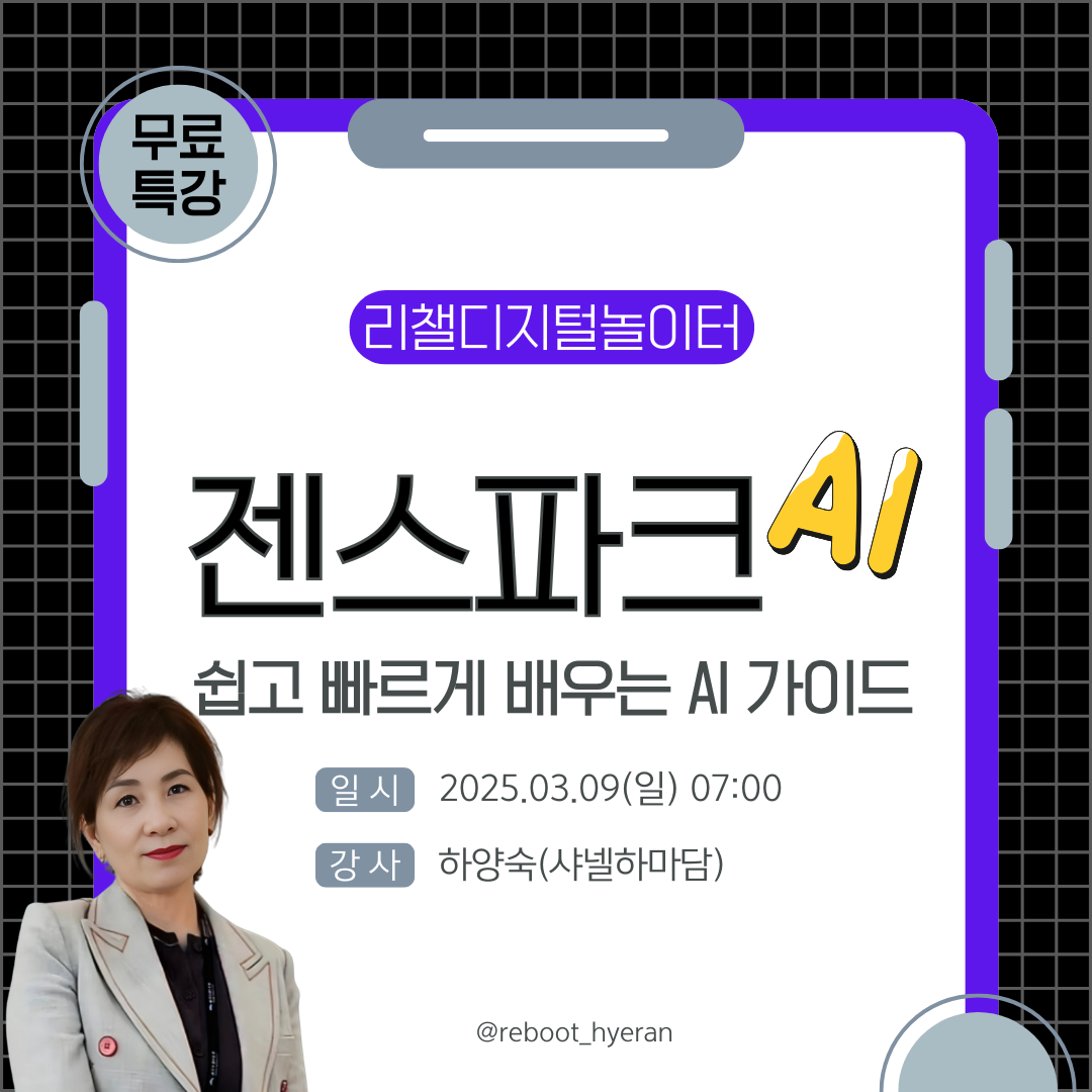 안녕하세요~! 리챌 커뮤니티 리더 리부트란입니다. 매월 한번씩 AI도구를 소개하고 실습하는 디지털놀이터를 진행하고 있습니다. 3월에는 젠스파크 AI의 주요 기능을 배우고 챗gpt와 비교해보고 캔바 실습까지 해볼거예요. ✅젠스파크의 특징은요? 젠스파크(Genspark) AI는 GPT 기술을 기반으로 한 강력한 AI 플랫폼으로, 텍스트 처리, 이미지 생성, 문서 요약 등 다양한 기능을 제공합니다. 높은 정확도와 빠른 응답 속도를 자랑하며, 비즈니스, 교육, 콘텐츠 제작 등 여러 분야에서 활용 가능합니다. 특히, 사용자의 요구를 이해하고 맞춤형 결과를 제공하는 점이 큰 장점입니다. 젠스파크는 실시간 웹 검색과 혼합 에이전트 시스템(MOA)을 통해 최신 정보를 제공하며, 사용자 친화적인 인터페이스로 누구나 쉽게 사용할 수 있습니다. ✅ 강의내용은? 젠스파크.AI 소개 젠스파크.AI 가입 및 기본 설정 젠스파크.AI의 주요 기능/챗gpt와 비교 텍스트 및 이미지 생성 후 캔바실습 젠스파크.AI의 고급 활용법 ✅강사를 소개해요 AI활용전문 하양숙 강사 ✅이런분들에게 추천합니다 AI를 배워야 될거 같은데 막막한 분 다양한 AI도구를 써보고 싶은 분 챗GPT와 젠스파크의 차이점을 알고 싶은 분 실습 위주로 진행되는 강의가 좋은 분 *본 강의는 무료로 제공합니다 *연결된 오픈채팅방에서 줌링크 공유드립니다 *강의후기 작성해주시는 분들에게 녹화본을 제공합니다