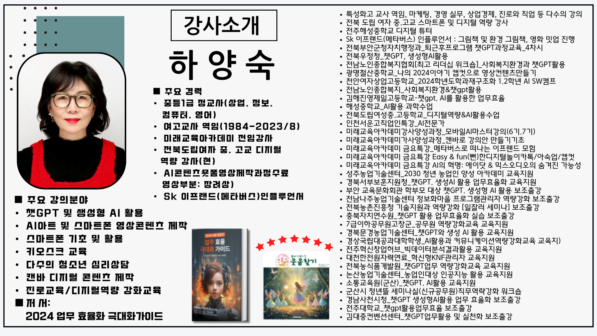 안녕하세요! 디지털&아트메신저 리부트란입니다 ^^ ♡디지털메신저♡ 디지털을 도구로 사람과 세상을 가치 있게 연결하고 브랜딩을 돕는 일을 하고 있습니다 2024.03~ 슬리드 공식티처/ AI투닝 공인강사 2022.05~현재 함께성장커뮤니티 리챌 리더 2025.04~ 현재 경기도디지털배움터 강사 2024.07~ 현재 카카오 단골시장 디지털튜터(서포터즈) 2024.04~ 한국사회복지협의회 사회서비스 디지털교육 강사 2022.07~ 24.08 SK텔레콤 이프랜드 공식인플루언서 2021.~ 25.08 홈플러스문화센터 스마트폰 강사 2025. 작지만 강한 커뮤니티 리더십 챌린지 2023. 지속가능한 멘토들 시즌1, 2 2023. 디지털에셋 나브랜딩첫걸음1, 2 2023.12~ 현재 큐리어스 어울림 리더 2023.12~ 현재 큐리어스 서포터즈 (시즌1~4) AI-POT(생성AI활용능력) 2급, AICE FUTURE 1급 모바일디지털튜터 1,2급, AIDE(인공지능데이터전문가)1급, ITQ OA 마스터, 투닝교육지도자2급, 학습코칭전문가 1급 ♡아트메신저♡ 칼림바를 좋아해서 연주하고 강의하는 일을 하고 있습니다. 작은음악 칼림바의 매력을 많은 분들에게 알려드리고 싶어요. 2022.07~22.08 굿짹월드 칼림바 합주챌린지 리더 2022.03~24.02 **초등학교 음악(칼림바)강사 2022.07~현재 쓰담쓰담G앙상블 2023.11~현재 큐리어스 힐링칼림바 어울림 리더 칼림바 음악지도사, 사회복지사, 평생교육사, 에니어그램 일반강사