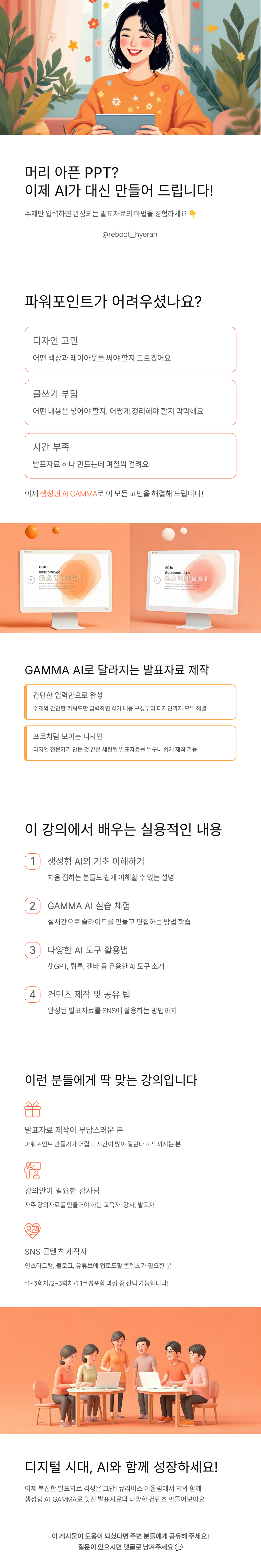 주제만 입력하면 멋진 발표자료 완성! 생성형 AI GAMMA로 쉽게 만드는 파워포인트 디자인 몰라도, 글을 잘 못 써도 OK! 이 강의는 생성형 AI 도구 'GAMMA'를 활용해 누구나 손쉽게 발표자료(PPT)를 만드는 체험형 수업입니다. 기획, 글쓰기, 디자인을 자동으로 처리해주는 GAMMA를 통해 중장년층도 손쉽게 멋진 슬라이드를 완성할 수 있도록 도와드립니다. 📚 강의 주요 내용 1. 생성형 AI 이해 2. PPT도구 소개: 뤼튼, 캔바, GAMMA AI 소개 3. GAMMA AI 실습 : 슬라이드 생성 및 편집방법 4. 시각화 도구 냅킨AI 실습 5. PPT를 활용한 컨텐츠 제작법 6. 활용법 및 공유 팁 📚이 강의의 특별한 점 - 챗GPT, 뤼튼, 감마, 릴리스, 노트북 LM, 캔바, 영상편집앱(인스타그램 EDITS, 유튜브쇼츠, 캡컷) 등 3회차 강의에서 다양한 AI도구와 콘텐츠 제작툴들을 배울 수 있습니다. - 실습형으로 진행됩니다. 만족한 결과물이 나올 수 있게 도와드립니다. - 참여하시는 분들에 맞게 개별 맞춤 교육을 제공합니다. 🎯 이런 분께 추천합니다 ✅ 파워포인트 만들기 어렵다고 느낀 분 ✅ 강의안, 발표자료를 자주 만드는 분 ✅ 생성형 AI를 쉽게 배워보고 싶은 중장년 ✅ 빠른 시간에 깔끔한 자료를 만들고 싶은 누구나 ✅ 기초부터 활용법까지 한번에 배우고 싶은 분 ✅ 인스타그램, 블로그, 유튜브에 업로드 하고 싶은 분 <유의사항> - 본 강의는 1~3회차, 또는 2~3회차, 코칭 포함 등 옵션 선택이 가능합니다. (8월에 수업 들으셨던 분들은 옵션 활용하세요) - 신청 후 오픈채팅방에 즉시 입장해주세요!)