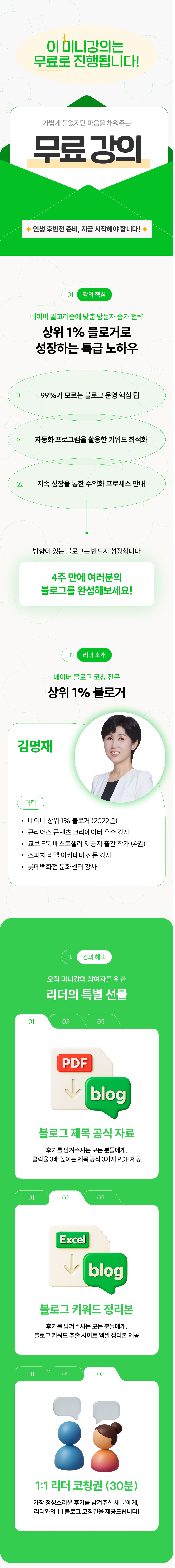 1. 기본 정보 * 생년 월일: 1974년 4월생 * 전문 분야: 블로그 코칭, 스피치 교육, 마인드 코칭 2. 핵심 성과 * 네이버 상위 1% 블로거 달성 * 교보 문고 베스트셀러 작가 & 4권 출간 공저 작가 * 큐리어스 콘텐츠 크리에이터 4기 우수 강사 선정 * 스피치 아카데미 라엘 전문 강사 3. 보유 자격증 * 블로그 마케팅 실전 전문가 * AI 콘텐츠 전문가 * 스피치 1급 지도사 * 디지털 튜터 1급 & 2급 자격증 * 성인 진로 지도사 4. 주요 활동 * 블로그 코칭 -> 콘텐츠 기획 & 작성법 교육, 수익화, 기록을 통한 브랜딩 * 교육 플랫폼 강사 활동 -> 큐리어스 우수 강사, 스피치 교육 * 작가 활동 -> 4권 출간(공저), 교보 문고 E북 에세이 베스트셀러 * 마돈나 오픈 채팅방 운영자 -> '마지막에 돈 내는 나'로 살고 싶은 사람들의 모임 5. 자기 소개 삶의 방향을 제시하는 김명재입니다. "인생은 속도가 아닌 방향이다" 라는 철학으로 블로그 코칭 전문가,기록 디자이너, 4권의 책을 출간한 작가로 많은 분들의 성장과 변화를 돕고 있습니다. * 블로그의 정석 사업 홍보 및 브랜딩이 되기 위해 가장 중요한 것은 키워드입니다. 돈이 되는 키워드에 대한 올바른 관점으로 상위 노출 제목 잡기, 글쓰기를 알려드립니다. 저품질이 되지 않기 위해 가장 필요한 것은 블로그에 대한 기본 지식을 탄탄히 쌓고, 스킬을 익히는 것이며, 좋은 양질의 글을 꾸준히 발행하는 것이죠. 그 노하우를 4주 과정을 통해 아낌없이 나누며, 함께 성장하고 수익화까지 돕겠습니다. * 검증된 콘텐츠 창작 능력. 4권의 다양한 장르 도서를 공저로 출간했습니다. 그 중 [마음에 길을 묻다]는 교보 문고 E북 에세이 베스트셀러에 오르는 성과를 거두었어요. 이러한 실전 경험을 바탕으로 단순한 이론이 아닌 실제 결과를 만드는 콘텐츠 교육을 제공합니다. * 협업과 네트워킹의 전문가. 모든 저서가 공저 작품인 만큼, 다양한 작가들과의 성공적인 협업 경험을 보유하고 있습니다. 이는 개인 창작자들의 네트워킹과 협업 기회 창출에도 도움을 드릴 수 있는 차별화된 강점입니다. * 블로그 운영과 개인 브랜딩에 모든 노하우를 수강생들과 함께 공유하고 성장하겠습니다. 감사합니다.