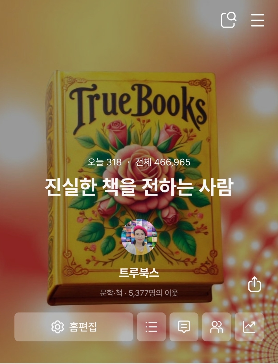 안녕하세요. 매일 매일 나를 들어 올리는 글을 쓰며 꿈을 꾸는 작가 트루북스입니다. 지난해 12월엔 공저책 <나는 나를 응원합니다.> 올해 8월엔 <글쓰기, 나를 만나는 여행> 전자책을 썼습니다. 그리고 2024년 <나를 일으키는 시>< 일상의 글쓰기> 를 발간했습니다. 이 모든 것이 ' 나를 발행하라' 라는 문구 '발행' 이라는 단어로 이루었다면 믿어 지시겠어요. 사실 발행하면 거창하게 생각되는데 마음을 조금 만 바꾸니 발행 아닌게 없더라구요. 작은 이모티콘, 댓글, 공감 표시도 발행입니다. 큐리어스 어울림을 만나 리더도 되고 서포터즈 활동도 하고 있습니다. 발행에 날개가 달린 거죠. 2025년 저는 '발행 메신저'로 거듭 나려고 합니다. 발행이 두려워 마음 속에만 꼭꼭 숨겨 둔 이야기를 한번 꺼내 보세요. 시작이 어렵지 하루 이틀 하다 보면 할 수 있습니다. 발행에 대한 생각을 바꾸고 두려움을 없애는 일 함께 하면 할 수 있습니다. 트루북스 큐리어스 나사랑챌린지 리더 퍼스널브랜딩전문가 1급 메타버스에서 1년 6개월 자작시로 활동 브런치 스토리 작가 '시에 빠진 글쓰기' 인스타그램, 1일 1포 꾸준한 블로그 포스팅 행복한 글쓰기, '나를 발행하라' 오픈 톡방 운영 작은 도서관 시쓰기 강의