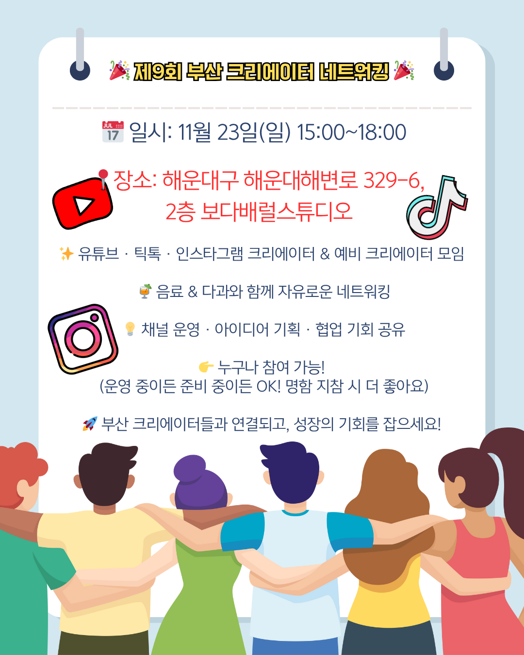 부산에서 활동하는 유튜버, 틱톡커, 인스타그램 크리에이터, 그리고 이제 막 시작하려는 예비 크리에이터까지 누구나 함께할 수 있는 네트워킹 모임이 열립니다.