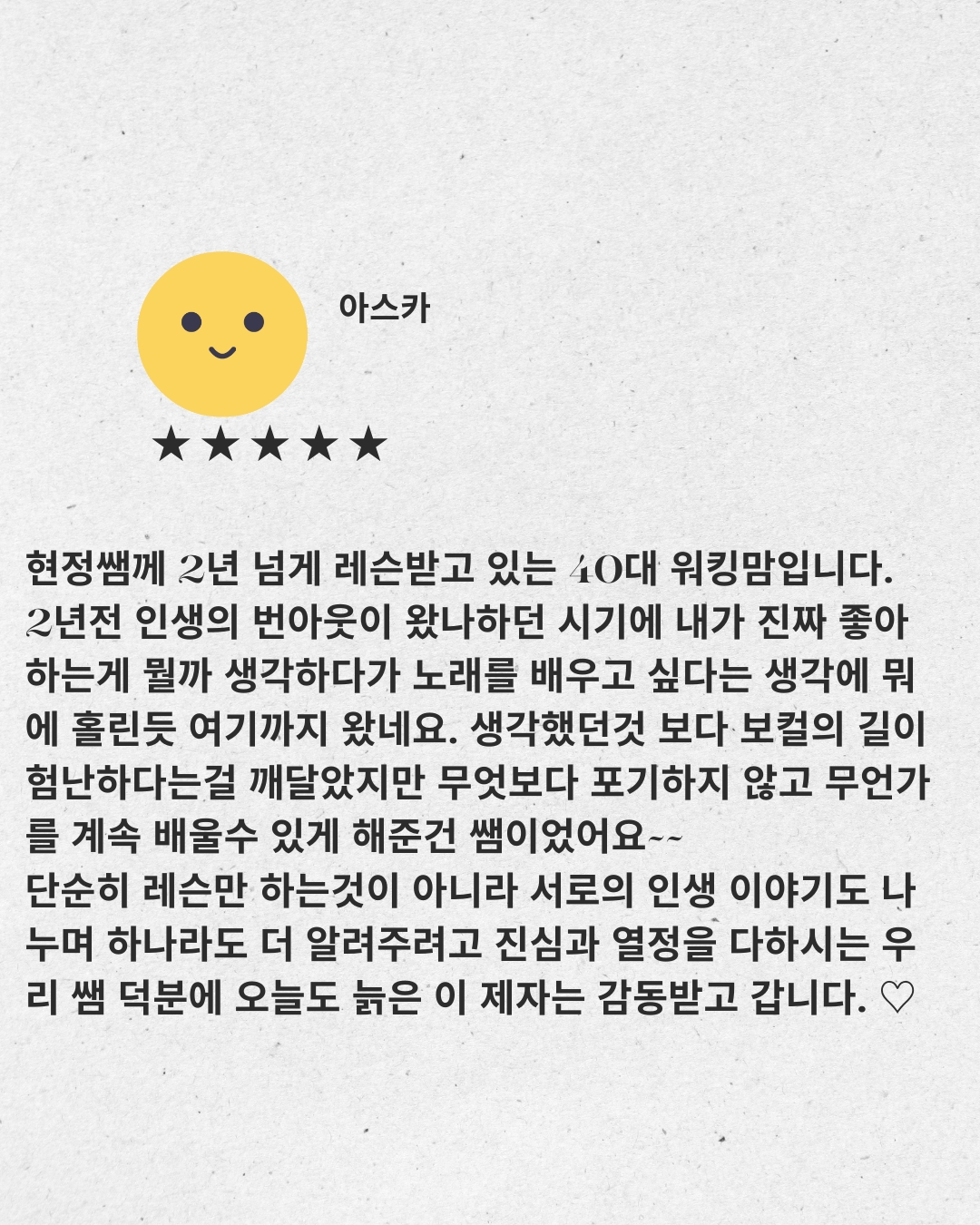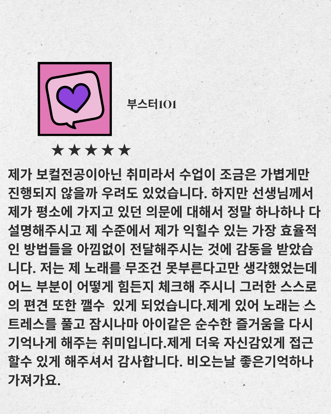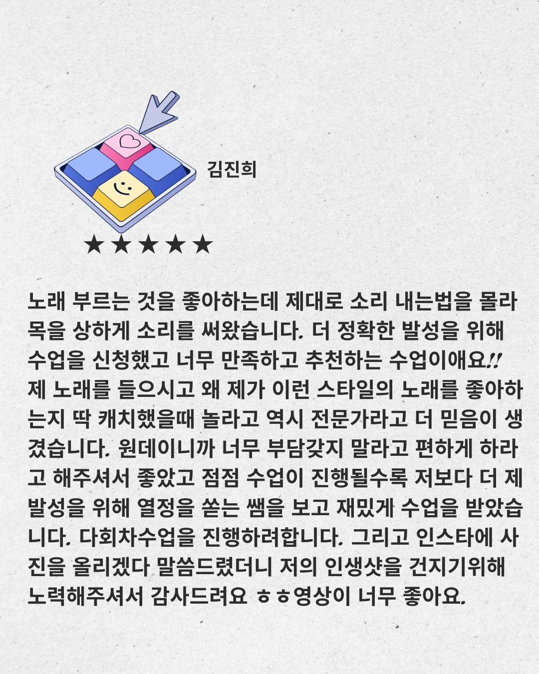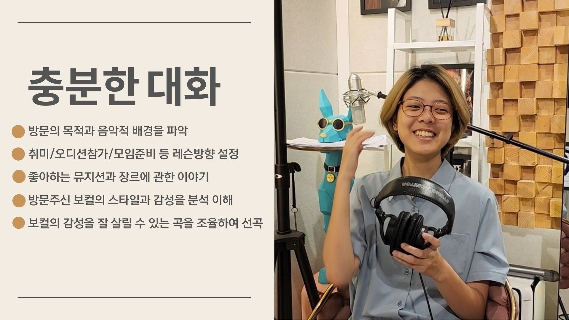 보컬의 마음을 헤아리는 고퀄리티 레슨으로 함께 하겠습니다.