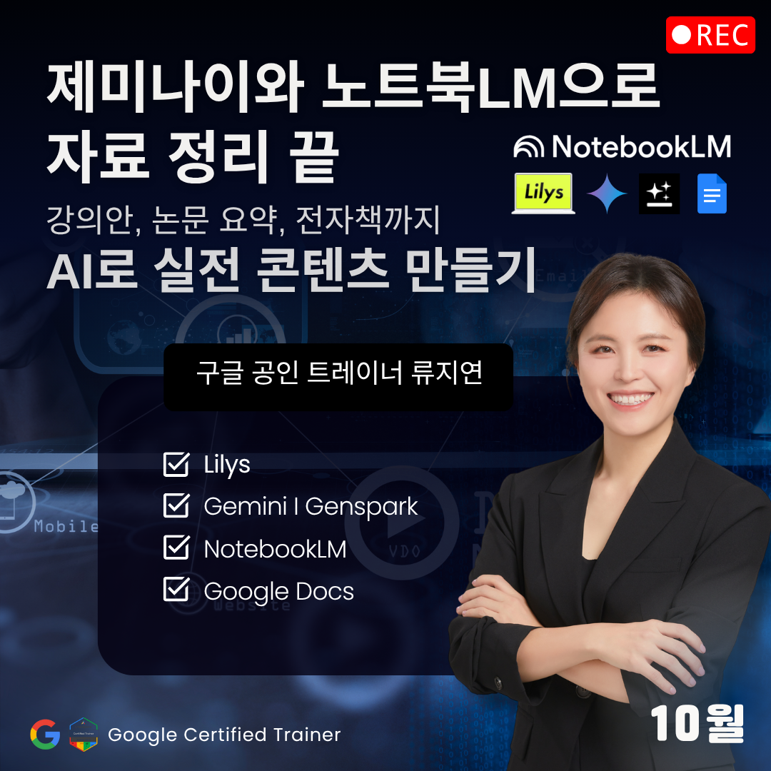 [VOD] 릴리스로 콘텐츠 정리의 판을 바꾸다 [10월12일 녹화본] <본 강의는 10월12일에 진행되었던, 릴리스로 콘텐츠 정리의 판을 바꾸다 의 녹화본입니다.> 제미나이와 노트북LM, 콘텐츠 정리의 판을 바꾸다 논문 요약, 브리핑 문서, 강의자료까지… AI와 함께하는 콘텐츠 전환법 📅 일시: 2025년 10월 12일 (일) 오후 7시 00분 👩🏫 리더: 류지연 (『1년의 미라클』 저자, 구글 공인 트레이너) <어울림 소개> 자료는 많은데… 정리는 안 되고, 어디에 뭘 써야 할지도 모르겠다면? AI 도구와 함께하는 실전 콘텐츠 정리 워크플로우가 시작됩니다. 이번 어울림에서는 Google 제미나이의 딥 리서치를 시작으로, 노트북LM을 활용한 자료 구조화, 릴리스의 요약, 젠스파크의 AI 슬라이드, 그리고 구글 문서에서의 실전 정리 및 공유까지 당신의 방대한 자료가 살아 움직이게 됩니다. <어울림 내용> 1️⃣ 제미나이 – 검색을 넘어선 ‘딥 리서치’ 논문, 정책자료, 이슈 키워드 등 원하는 주제를 입력하면 AI가 웹사이트를 직접 분석해 깊이 있는 보고서를 만들어줍니다. 2️⃣ 노트북LM – AI 구조화의 핵심! PDF, 유튜브, 텍스트, 구글 문서 등 다양한 자료를 넣으면 자동으로 브리핑 문서, 학습 가이드, FAQ, 타임라인, 퀴즈까지 생성! 오디오와 한국어 동영상까지 뚝딱! 특히 논문 요약 및 인사이트 추출에 탁월한 기능을 실습으로 배워봅니다. 3️⃣ 릴리스 + 젠스파크 + 구글 문서 – 콘텐츠 완성 워크플로우 ✅유튜브 영상 요약은 릴리스로, ✅슬라이드 자동 생성은 젠스파크로, ✅최종 정리는 구글 문서에서 협업 및 공유까지! ✅ 논문 요약부터 강의자료까지 실전 콘텐츠로 변환 가능 AI 도구를 활용해 내가 가진 자료를 새로운 콘텐츠로 재탄생시킬 수 있습니다. ✅ 제미나이의 딥 리서치 추천 흐름 전격 공개 검색이 아닌 ‘분석’ 기반의 리서치 도구 사용법을 배워보세요. ✅ 자료 구조화 + 자동 슬라이드 + 협업 문서까지 연계 학습 AI를 도구별로 배운 게 아니라, 하나의 흐름으로 이어집니다. ✅ 전부 따라 할 수 있는 실습 중심 클래스 강의 후에도 혼자서 다시 해볼 수 있게, 단계별로 차근차근 실습합니다. <이런 분들, 절대 놓치지 마세요!> 논문, 리서치 문서를 쉽게 요약/정리하고 싶은 분 강의안, 전자책, 블로그 콘텐츠 등을 한 번에 만들고 싶은 분 다양한 AI 도구(제미나이, 노트북LM, 릴리스 등)를 연결해 실전 적용하고 싶은 분 디지털 자료를 정리하고 콘텐츠화하고 싶은 강사, 작가, 퍼스널 브랜딩 실천가 중장년층이지만 AI 도구 실전 활용법을 배우고 싶은 분 💼 강의 자료 제공 여부 실습용 구글 문서 제공 ✅ 강의 녹화본 제공 (VOD 예정) ✅