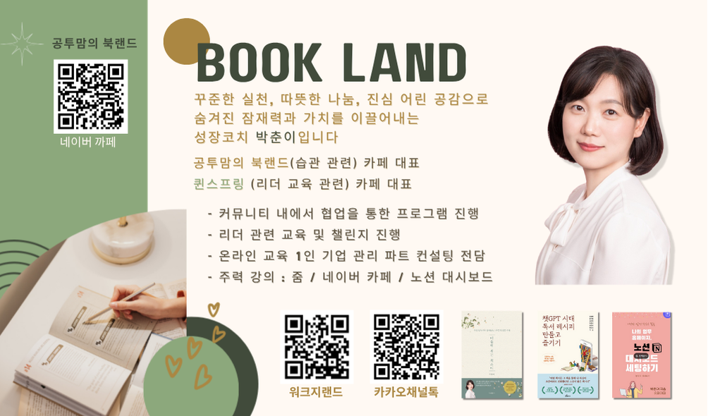 안녕하세요! 독서, 습관, 글쓰기에 진심인 온라인 커뮤니티 대표입니다^^ 현재 <공투맘의 북랜드>라는 온라인 커뮤니티를 운영하고 있구요. 나의 장점을 활용하여 작은 모임 리더가 될 때 도움이 될만한 프로그램들도 여러분을 만나볼 예정입니다. 제가 만든 워크지 관련 강의는 1달에 2번 무료 강의로 만나보실 수 있구요. 차차 도움이 되실 실속있는 유료 프로그램들도 오픈해 나가보도록 할게요❤
