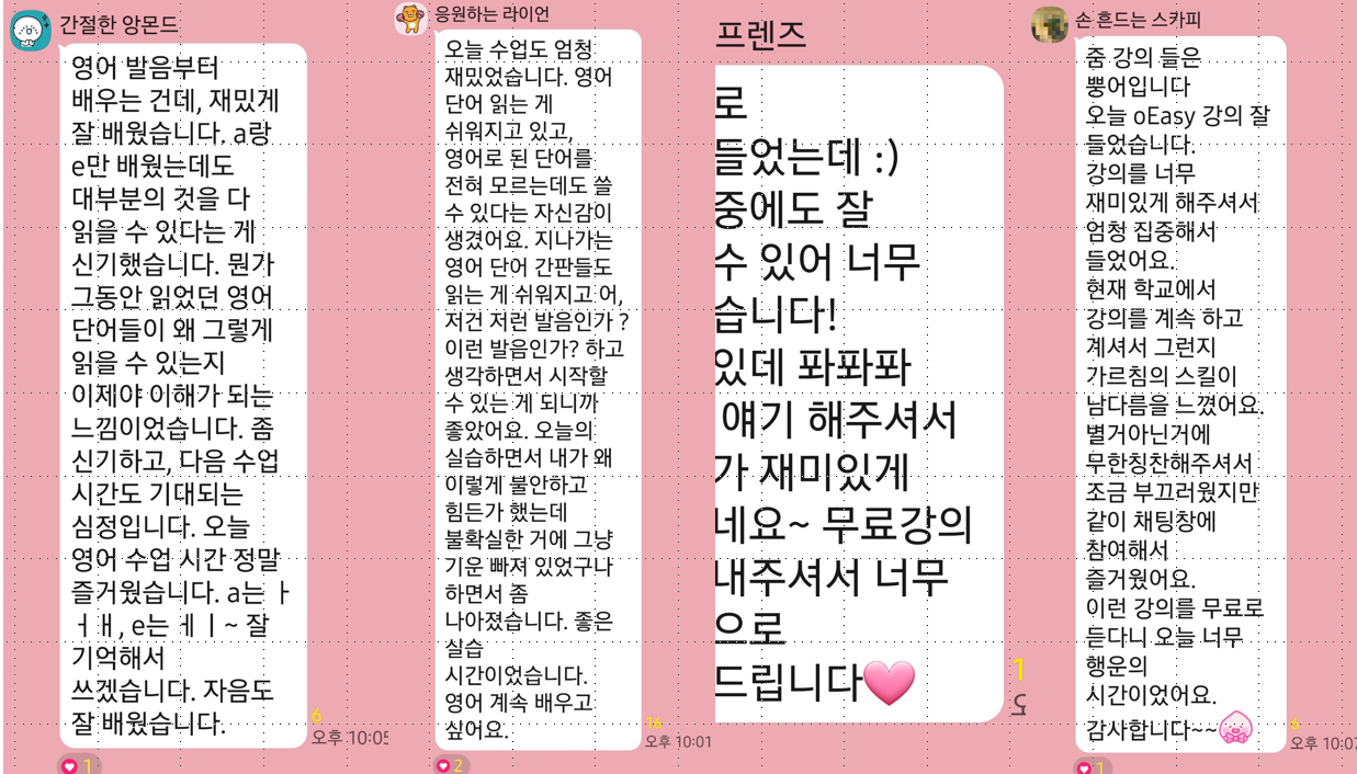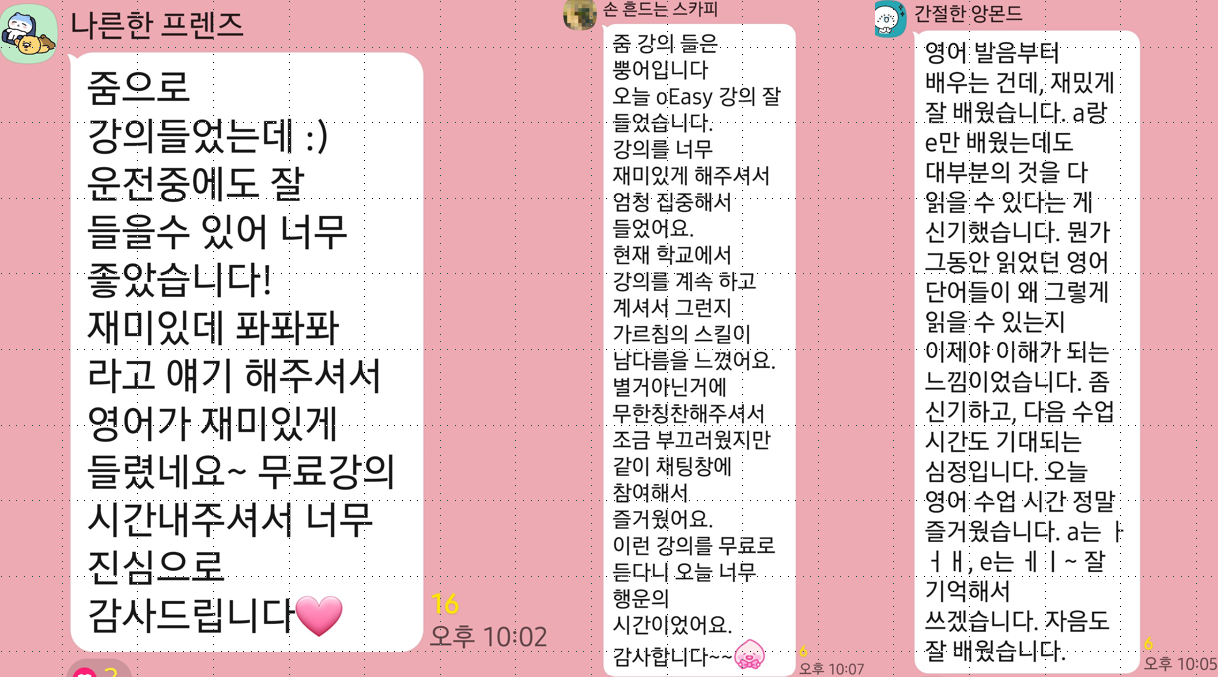 문법이 아니라, “입 → 귀 → 말하기 흐름” 중심으로 자연스럽게 사용.교재 0원