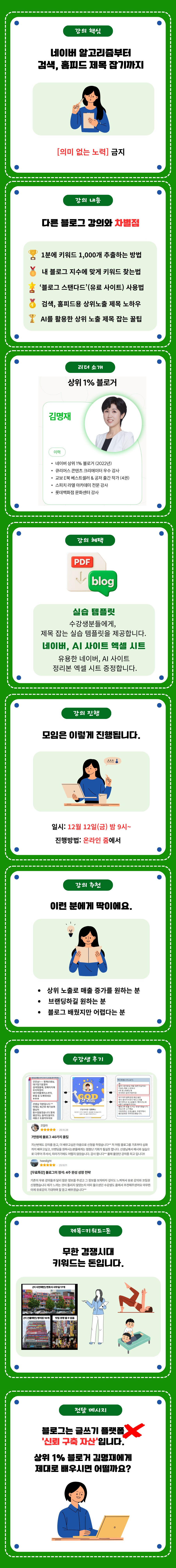 1. 기본 정보 * 생년 월일: 1974년 4월생 * 전문 분야: 블로그 코칭, 스피치 교육, 마인드 코칭 2. 핵심 성과 * 네이버 상위 1% 블로거 달성 * 교보 문고 베스트셀러 작가 & 4권 출간 공저 작가 * 큐리어스 콘텐츠 크리에이터 4기 우수 강사 선정 * 스피치 아카데미 라엘 전문 강사 3. 보유 자격증 * 블로그 마케팅 실전 전문가 * AI 콘텐츠 전문가 * 스피치 1급 지도사 * 디지털 튜터 1급 & 2급 자격증 * 성인 진로 지도사 4. 주요 활동 * 블로그 코칭 -> 콘텐츠 기획 & 작성법 교육, 수익화, 기록을 통한 브랜딩 * 교육 플랫폼 강사 활동 -> 큐리어스 우수 강사, 스피치 교육 * 작가 활동 -> 4권 출간(공저), 교보 문고 E북 에세이 베스트셀러 * 마돈나 오픈 채팅방 운영자 -> '마지막에 돈 내는 나'로 살고 싶은 사람들의 모임 5. 자기 소개 삶의 방향을 제시하는 김명재입니다. "인생은 속도가 아닌 방향이다" 라는 철학으로 블로그 코칭 전문가,기록 디자이너, 4권의 책을 출간한 작가로 많은 분들의 성장과 변화를 돕고 있습니다. * 블로그의 정석 사업 홍보 및 브랜딩이 되기 위해 가장 중요한 것은 키워드입니다. 돈이 되는 키워드에 대한 올바른 관점으로 상위 노출 제목 잡기, 글쓰기를 알려드립니다. 저품질이 되지 않기 위해 가장 필요한 것은 블로그에 대한 기본 지식을 탄탄히 쌓고, 스킬을 익히는 것이며, 좋은 양질의 글을 꾸준히 발행하는 것이죠. 그 노하우를 4주 과정을 통해 아낌없이 나누며, 함께 성장하고 수익화까지 돕겠습니다. * 검증된 콘텐츠 창작 능력. 4권의 다양한 장르 도서를 공저로 출간했습니다. 그 중 [마음에 길을 묻다]는 교보 문고 E북 에세이 베스트셀러에 오르는 성과를 거두었어요. 이러한 실전 경험을 바탕으로 단순한 이론이 아닌 실제 결과를 만드는 콘텐츠 교육을 제공합니다. * 협업과 네트워킹의 전문가. 모든 저서가 공저 작품인 만큼, 다양한 작가들과의 성공적인 협업 경험을 보유하고 있습니다. 이는 개인 창작자들의 네트워킹과 협업 기회 창출에도 도움을 드릴 수 있는 차별화된 강점입니다. * 블로그 운영과 개인 브랜딩에 모든 노하우를 수강생들과 함께 공유하고 성장하겠습니다. 감사합니다.
