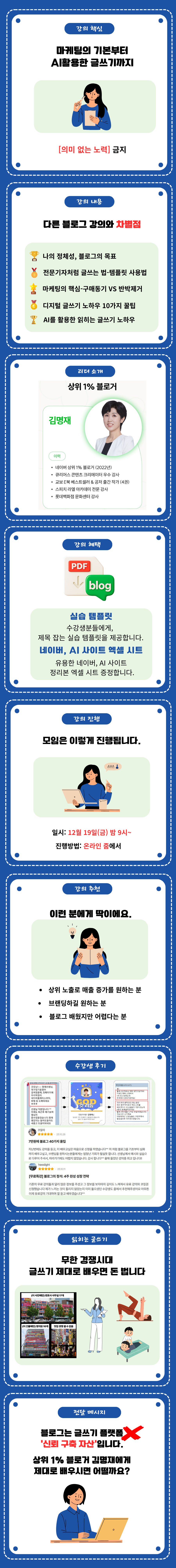 1. 기본 정보 * 생년 월일: 1974년 4월생 * 전문 분야: 블로그 코칭, 스피치 교육, 마인드 코칭 2. 핵심 성과 * 네이버 상위 1% 블로거 달성 * 교보 문고 베스트셀러 작가 & 4권 출간 공저 작가 * 큐리어스 콘텐츠 크리에이터 4기 우수 강사 선정 * 스피치 아카데미 라엘 전문 강사 3. 보유 자격증 * 블로그 마케팅 실전 전문가 * AI 콘텐츠 전문가 * 스피치 1급 지도사 * 디지털 튜터 1급 & 2급 자격증 * 성인 진로 지도사 4. 주요 활동 * 블로그 코칭 -> 콘텐츠 기획 & 작성법 교육, 수익화, 기록을 통한 브랜딩 * 교육 플랫폼 강사 활동 -> 큐리어스 우수 강사, 스피치 교육 * 작가 활동 -> 4권 출간(공저), 교보 문고 E북 에세이 베스트셀러 * 마돈나 오픈 채팅방 운영자 -> '마지막에 돈 내는 나'로 살고 싶은 사람들의 모임 5. 자기 소개 삶의 방향을 제시하는 김명재입니다. "인생은 속도가 아닌 방향이다" 라는 철학으로 블로그 코칭 전문가,기록 디자이너, 4권의 책을 출간한 작가로 많은 분들의 성장과 변화를 돕고 있습니다. * 블로그의 정석 사업 홍보 및 브랜딩이 되기 위해 가장 중요한 것은 키워드입니다. 돈이 되는 키워드에 대한 올바른 관점으로 상위 노출 제목 잡기, 글쓰기를 알려드립니다. 저품질이 되지 않기 위해 가장 필요한 것은 블로그에 대한 기본 지식을 탄탄히 쌓고, 스킬을 익히는 것이며, 좋은 양질의 글을 꾸준히 발행하는 것이죠. 그 노하우를 4주 과정을 통해 아낌없이 나누며, 함께 성장하고 수익화까지 돕겠습니다. * 검증된 콘텐츠 창작 능력. 4권의 다양한 장르 도서를 공저로 출간했습니다. 그 중 [마음에 길을 묻다]는 교보 문고 E북 에세이 베스트셀러에 오르는 성과를 거두었어요. 이러한 실전 경험을 바탕으로 단순한 이론이 아닌 실제 결과를 만드는 콘텐츠 교육을 제공합니다. * 협업과 네트워킹의 전문가. 모든 저서가 공저 작품인 만큼, 다양한 작가들과의 성공적인 협업 경험을 보유하고 있습니다. 이는 개인 창작자들의 네트워킹과 협업 기회 창출에도 도움을 드릴 수 있는 차별화된 강점입니다. * 블로그 운영과 개인 브랜딩에 모든 노하우를 수강생들과 함께 공유하고 성장하겠습니다. 감사합니다.