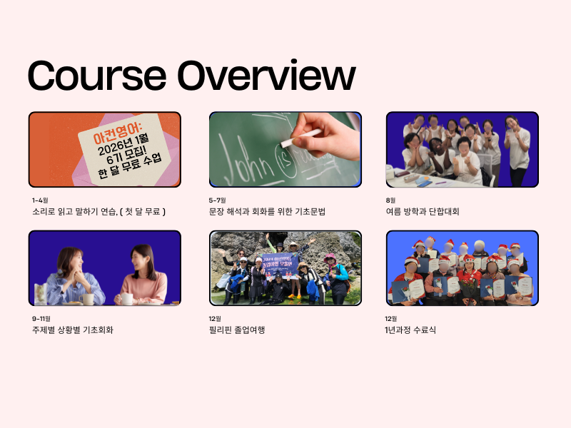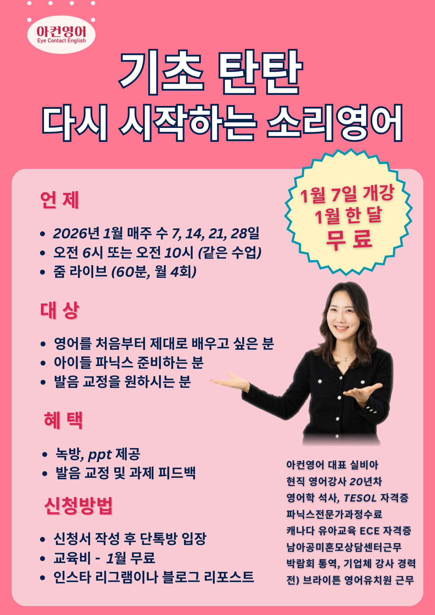 안녕하세요. 3060 여성 여러분! 저는 [중장년 여성들을 대상]으로 영어를 지도하고 있는 [아컨영어] 실비아입니다. 영어 읽기가 두려우신가요? 영어 때문에 자신감이 떨어지시나요? 어릴 적 영어에 대한 상처로 다시 시작하는데 어려움이 있으신가요? 이 모든걸 해결해 드리는 중장년 여성 전문 강사 실비아가 여러분을 기다리고 있습니다. 저는 2022년부터 지금까지 꾸준히 비대면으로 학생들을 지도하고 있으며 현재2026년에 함께 할 6기 학생들을 모집하고 있습니다. 대부분 3060 연령대의 학생들로 처음 알파벳 읽기부터 발음교정, 소리로 읽기 문장 읽기 1년 과정으로 이끌어 드리고 있습니다. 모든게 불가능해 보이지만 여러분의 선배들이 그 증인이 되어 "할 수 있다"는 기적을 만들고 있습니다. 여러분 저와 함께 영어 다시 시작하세요! 충분히 할 수 있습니다!