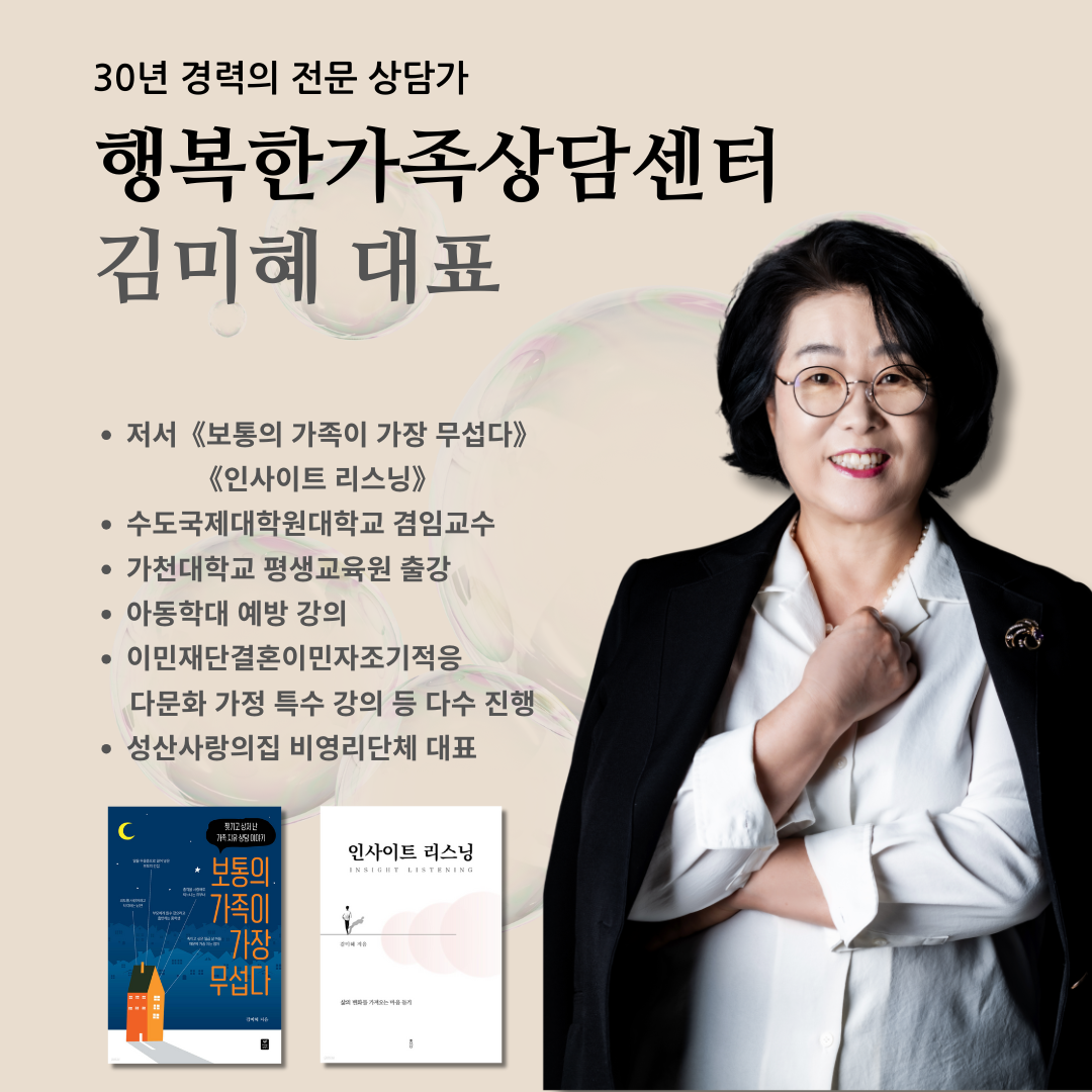 25년 경력 상담전문가, 감정코칭으로 성과와 관계를 바꿉니다. 사회복지학 박사이자 현실치료 기반 상담전문가 김미혜입니다. 학생·부모·교사와의 상담 3,000회 이상, 변화의 순간을 함께해왔습니다. 감정을 이해하면, 성과가 달라지고 관계가 회복됩니다. 저는 감정의 언어를 읽고, 그것이 일·관계·삶 전반에 어떻게 작용하는지를 안내하는 현실치료 기반 감정코칭과 가족상담, 의사소통 훈련을 전문으로 하고 있습니다. 25년간 교육 현장에서 학생과 부모, 교사의 마음을 잇는 상담을 해오며, ‘감정을 읽고 돌보는 힘’이 삶에 얼마나 큰 변화를 가져오는지 수많은 현장에서 확인해 왔습니다. 수천 회의 상담, 수많은 회복의 여정 속에서 사람들이 감정을 다르게 보고, 다르게 말하고, 다르게 반응하면서 인생의 전환점을 맞는 순간들을 함께했습니다. 강의에서는 상담실 안에서 만났던 회복과 성장의 실제 사례들을 통해 참여자 스스로도 감정을 이해하고 다룰 수 있도록 돕는 실질적인 방법을 나눕니다. 감정은 단순한 기분이 아니라, 삶의 방향을 바꾸는 힘입니다. 지금, 감정으로부터 다시 시작해보시겠어요?