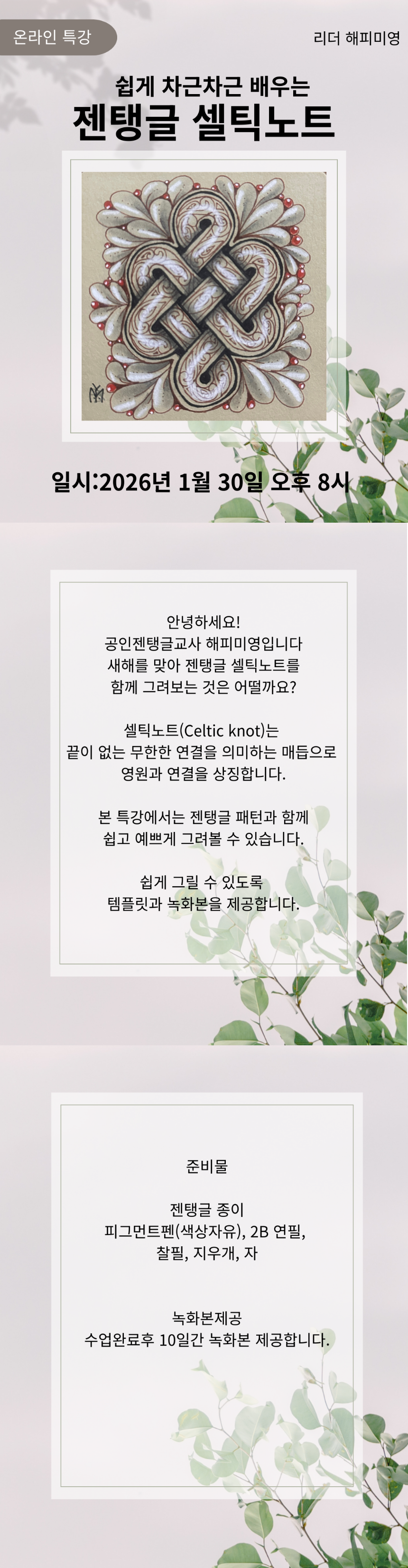 안녕하세요! 국제공인젠탱글교사 해피미영CZT 입니다~! 2018년 젠탱글 자격증 취득후 국내 젠탱글 보급을 위한 교육과 활동을 해오고 있어요. 젠탱글을 활용한 다양한 시도와 새로운 도전을 이어가고 있습니다. 실수는 없다, 정답이 없다는 젠탱글의 철학을 바탕으로 많은 분들이 젠탱글로 행복한 일상을 만들어 가기 바랍니다. 한국CZT협회 이사 /교육부장 역임 한국젠탱글협회 CZT정회원 관악미술협회 사무국장/ 디자인분과장역임 이프랜드 우수인플루언서 선린중 자유학기제 강사 금천구 마을강사 및 만천명월 예술인 회원 자연환경안전예술협회 초대작가 2025 서울시 늘봄학교 프로그램 강사 캘리그라피 지도사 수채캘리그라피1급 마커데코켈리그라피지도사 타로교육마스터 타로상담마스터 애니어그램 강사 ITQ OA마스터 학습상담2급 디지털윤리지도사