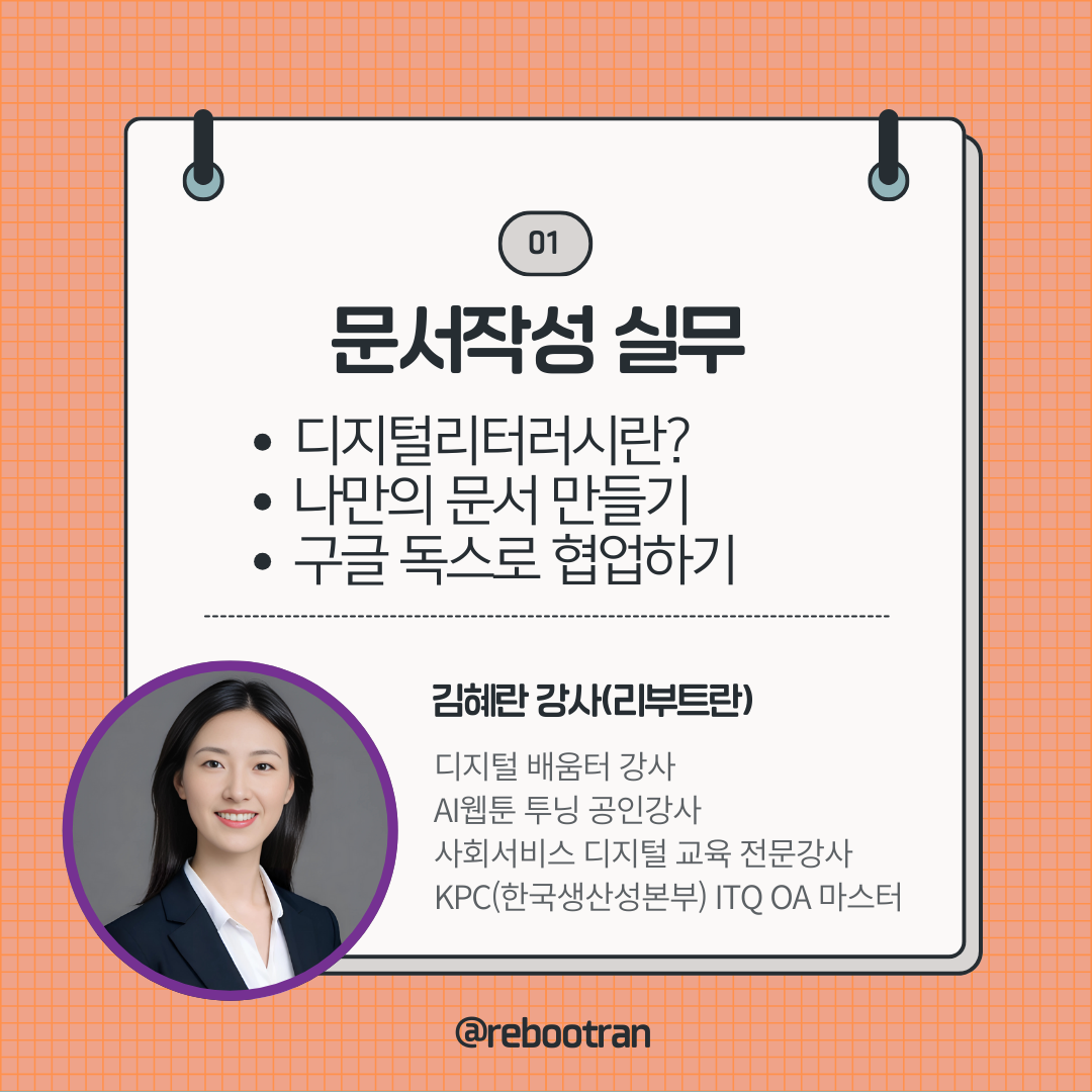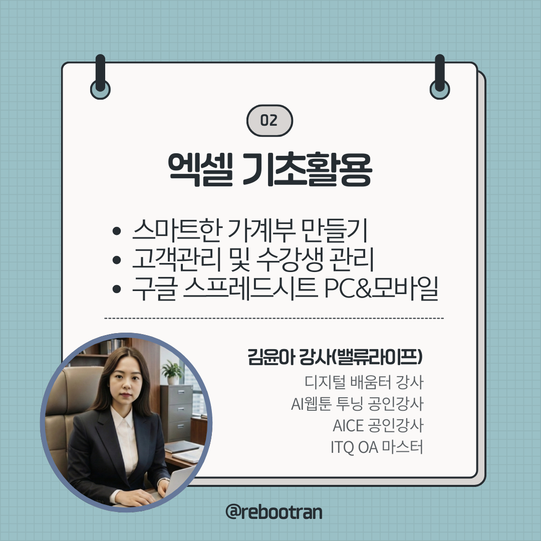 ITQ마스터이자 중장년들을 위한 디지털강사 리부트란과 밸류라이트가 멘토가 되어 어려운 용어는 빼고, 딱 필요한 기능만 쏙쏙 골라 알려드립니다.