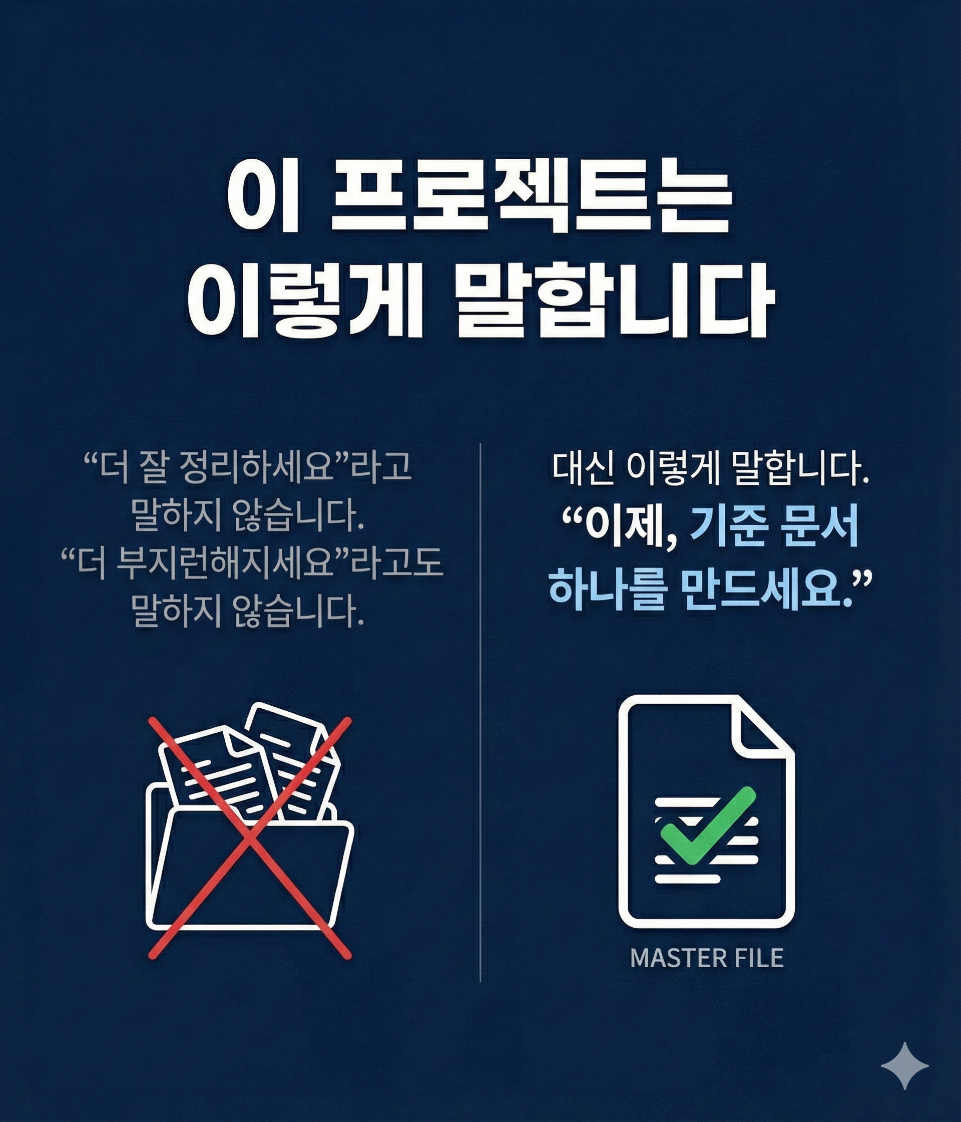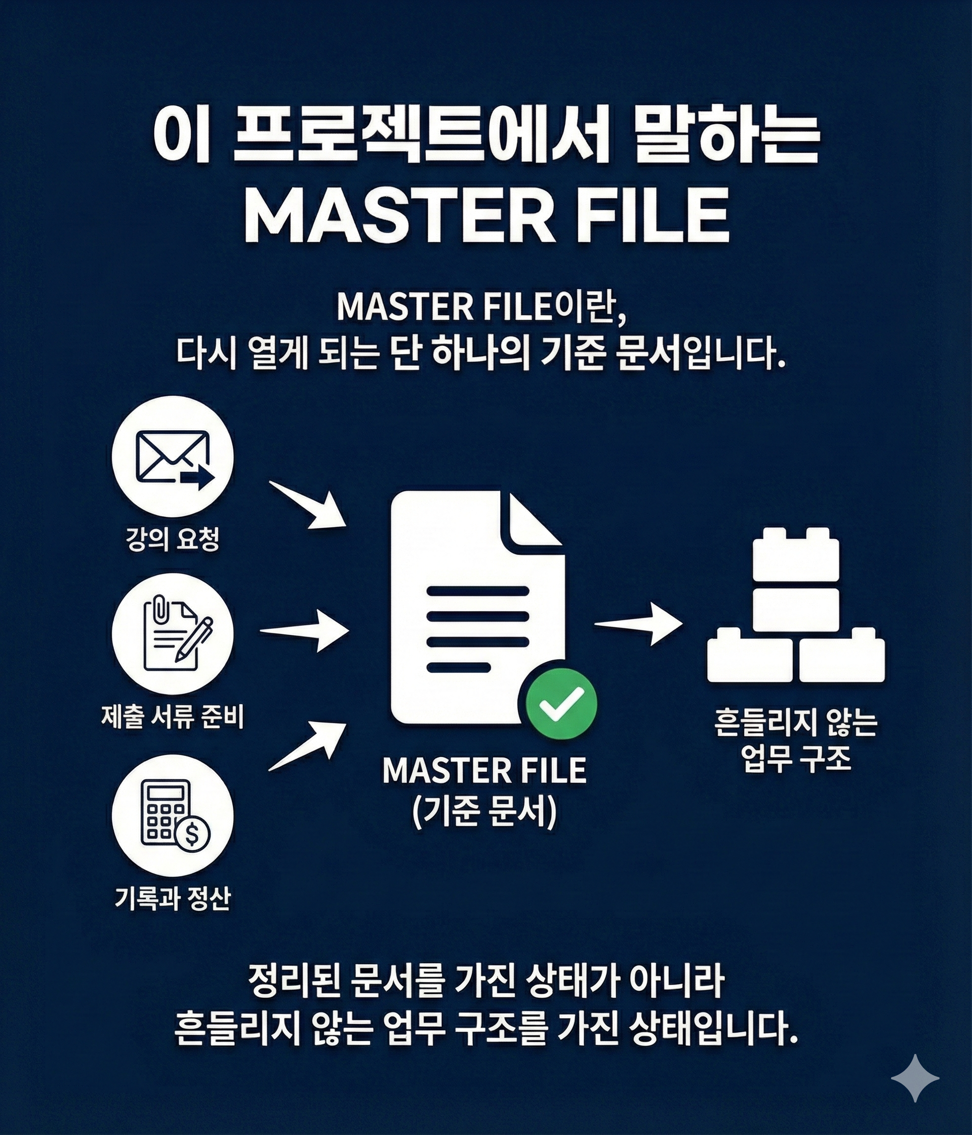 이 프로젝트에서 말하는 MASTER FILE은 문서 하나를 잘 만들어두는 일이 아닙니다.