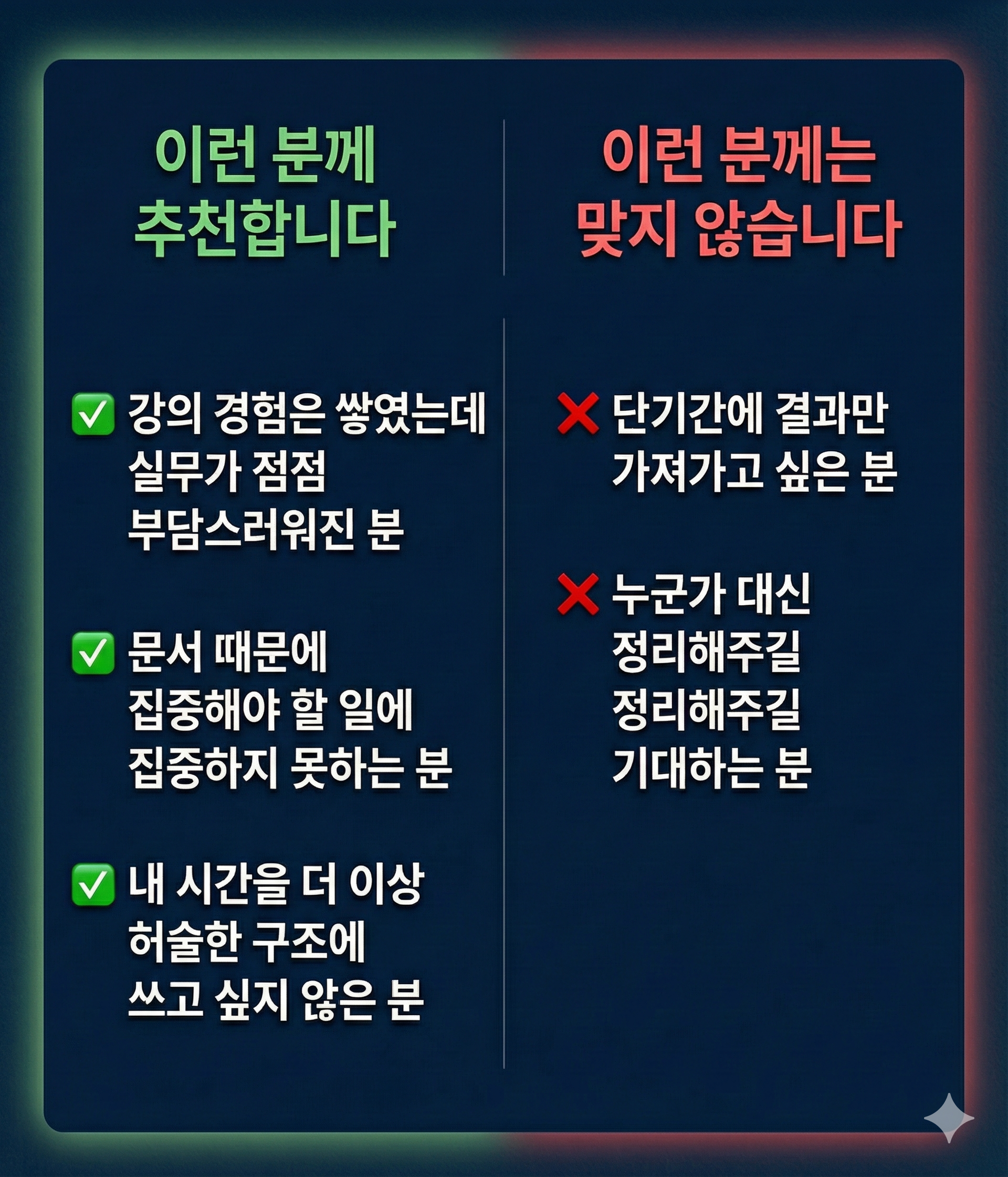 이 프로젝트는 더 잘하고 싶은 사람을 위한 수업이 아니라, 이미 잘해온 사람이 덜 불안하게 일하기 위한 프로젝트입니다.