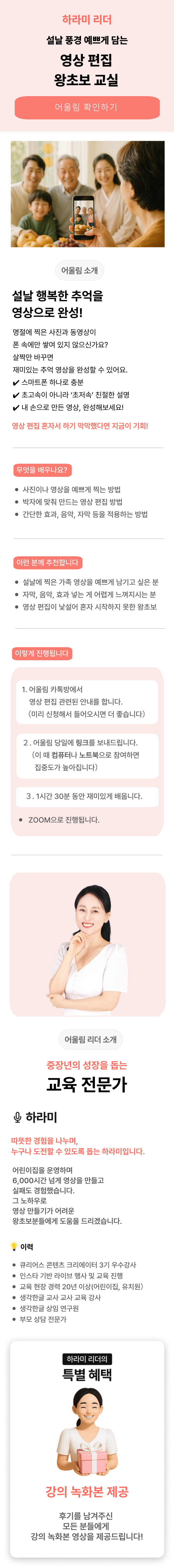 따뜻한 경험을 나누며 누구나 할 수 있도록 돕는 하라미 류혜진입니다. 어린이집을 운영하며 6,000시간 넘게 영상을 만들고 실패도 경험했습니다. 그 노하우로 영상 만들기가 어려운 왕왕 초보분들에게 도움을 드리겠습니다!