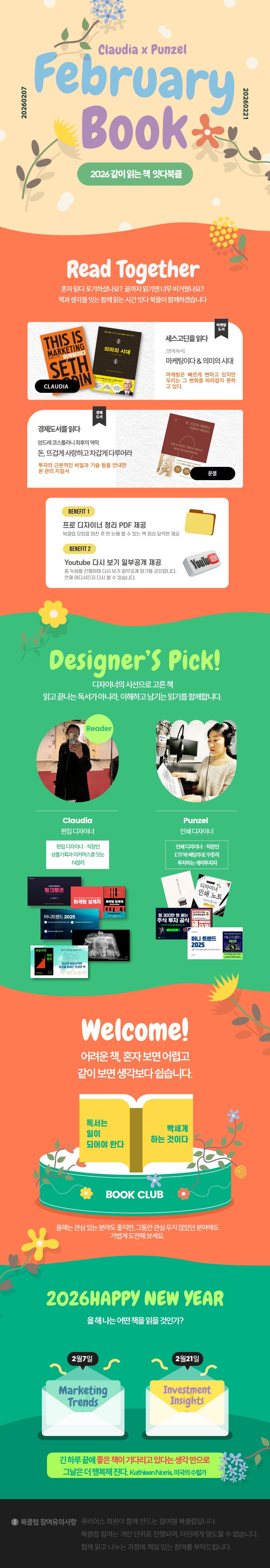 안녕하세요! 클라우디아/Claudia_letter입니다~! 🌿 잇다북클럽 리더 | 현역 디자이너 📚 『퇴근 후 일상, 글 그림일기』 무엇이든 읽고, 정리하고, 흐름을 전합니다 마케팅 · 트렌드 · 경제 삶의 기록 ✍🏻 브런치스토리 작가 현직 편집디자이너이자 마케팅·이커머스 기획자로 일하며, 트렌드와 소비의 흐름을 현장에서 경험하고 있습니다. 현장에서 마주하는 변화와 문제를 이해하기 위해 읽는 책으로 나누고 있습니다. 마케팅·트렌드·경제 도서를 통해 지금 시장이 어디로 흐르고 있는지 점검합니다 함께 읽는 책의 힘을 믿기에, 읽은 내용을 정리하고 나누는 일을 이어가고 있습니다. 오늘도 나에게 필요한 읽기를 선택하며, 책과 현장을 잇는 기록을 이어갑니다.