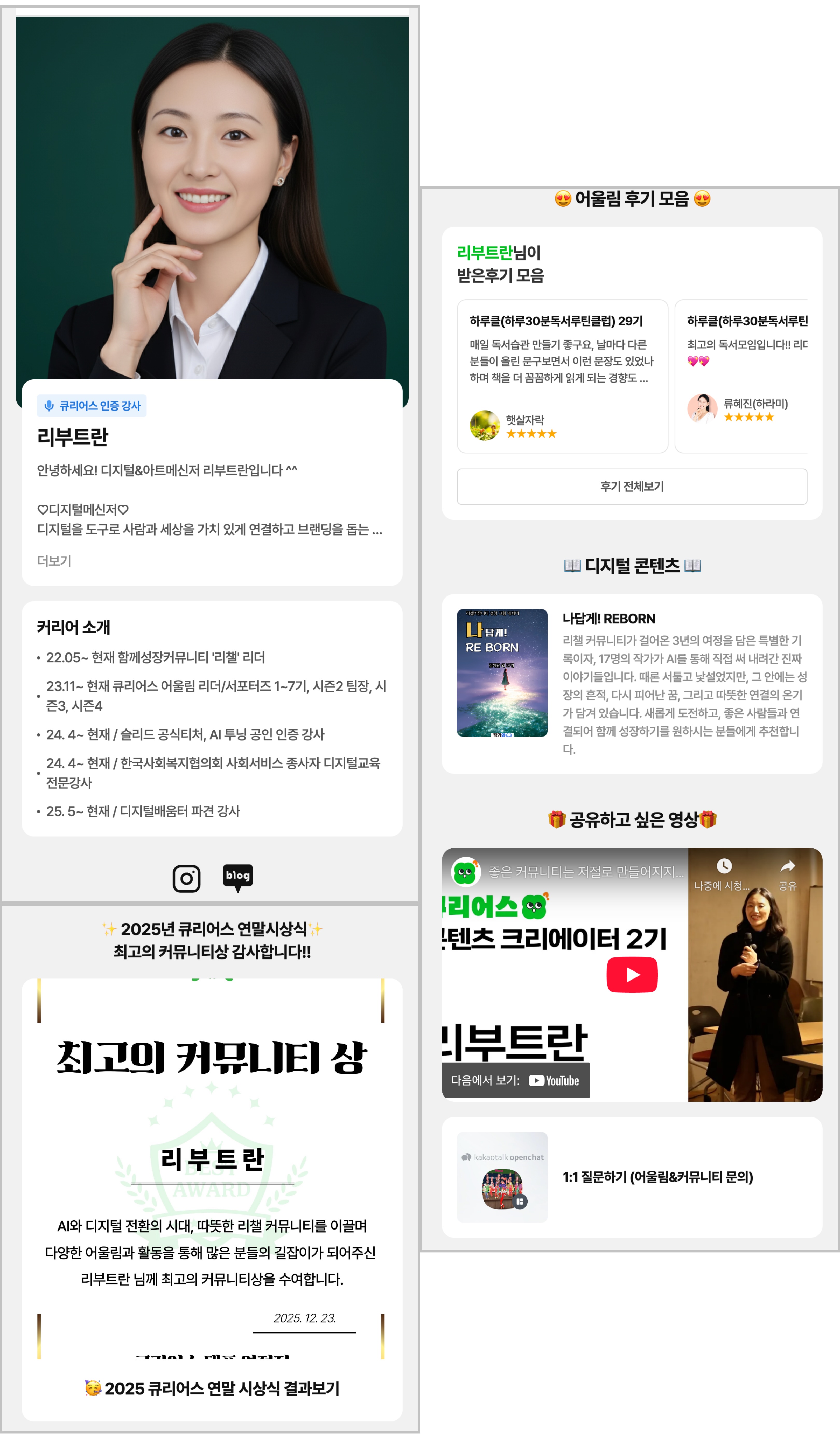 안녕하세요! 디지털&아트메신저 리부트란입니다 ^^ ♡디지털메신저♡ 디지털을 도구로 사람과 세상을 가치 있게 연결하고 브랜딩을 돕는 일을 하고 있습니다 2024.03~ 슬리드 공식티처/ AI투닝 공인강사 2022.05~현재 함께성장커뮤니티 리챌 리더 2025.04~ 현재 경기도디지털배움터 강사 2024.07~ 현재 카카오 단골시장 디지털튜터(서포터즈) 2024.04~ 한국사회복지협의회 사회서비스 디지털교육 강사 2022.07~ 24.08 SK텔레콤 이프랜드 공식인플루언서 2021.~ 25.08 홈플러스문화센터 스마트폰 강사 2025. 작지만 강한 커뮤니티 리더십 챌린지 2023. 지속가능한 멘토들 시즌1, 2 2023. 디지털에셋 나브랜딩첫걸음1, 2 2023.12~ 현재 큐리어스 어울림 리더 2023.12~ 현재 큐리어스 서포터즈 (시즌1~4) 모바일디지털튜터 1,2급, AIDE(인공지능데이터전문가)1급 ITQ OA 마스터, 투닝교육지도자2급, 학습코칭전문가 1급, 생성AI활용능력 2급, AICE FUTURE 1급 ♡아트메신저♡ 칼림바를 좋아해서 연주하고 강의하는 일을 하고 있습니다. 작은음악 칼림바의 매력을 많은 분들에게 알려드리고 싶어요. 2022.07~22.08 굿짹월드 칼림바 합주챌린지 리더 2022.03~24.02 **초등학교 음악(칼림바)강사 2022.07~현재 쓰담쓰담G앙상블 2023.11~현재 큐리어스 힐링칼림바 어울림 리더 칼림바 음악지도사, 사회복지사, 평생교육사, 에니어그램 일반강사