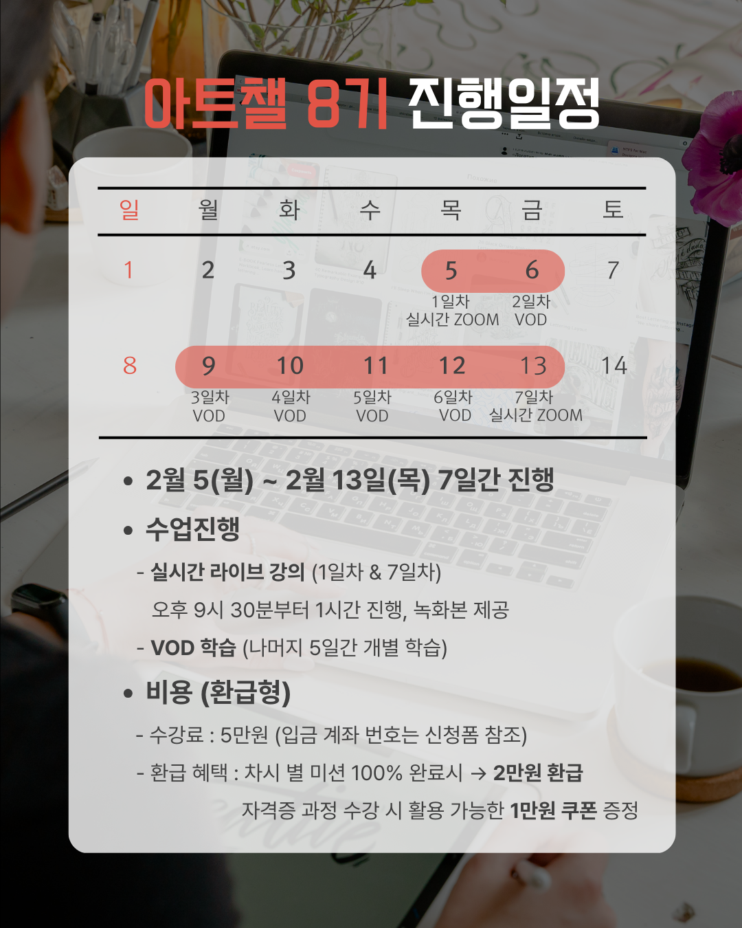 아이디어는 많은데 정작 눈에 보이는 결과물로 만들려니 답답하셨나요? 디자인 감각은 타고나야 한다고 생각하시나요? 아닙니다. 우리에게 필요한 것은 거창한 예술적 감각이 아니라 내 생각을 막힘없이 표현해 줄 '제대로 된 도구'입니다. 단 7일 만에 Canva를 장악하고 평생 사용할 나만의 든든한 무기로 만들 수 있는 캔바 완전 정복 아트챌 8기 참여자를 모집합니다.