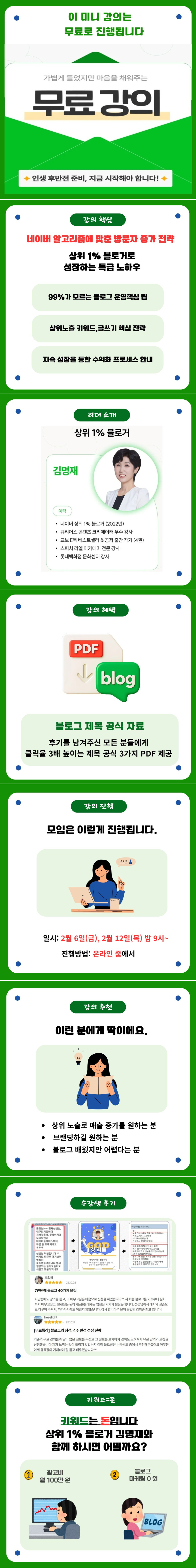 1. 기본 정보 * 생년 월일: 1974년 4월생 * 전문 분야: 블로그 코칭, 스피치 교육, 마인드 코칭 2. 핵심 성과 * 네이버 상위 1% 블로거 달성 * 교보 문고 베스트셀러 작가 & 4권 출간 공저 작가 * 큐리어스 콘텐츠 크리에이터 4기 우수 강사 선정 * 스피치 아카데미 라엘 전문 강사 3. 보유 자격증 * 블로그 마케팅 실전 전문가 * AI 콘텐츠 전문가 * 스피치 1급 지도사 * 디지털 튜터 1급 & 2급 자격증 * 성인 진로 지도사 4. 주요 활동 * 블로그 코칭 -> 콘텐츠 기획 & 작성법 교육, 수익화, 기록을 통한 브랜딩 * 교육 플랫폼 강사 활동 -> 큐리어스 우수 강사, 스피치 교육 * 작가 활동 -> 4권 출간(공저), 교보 문고 E북 에세이 베스트셀러 * 마돈나 오픈 채팅방 운영자 -> '마지막에 돈 내는 나'로 살고 싶은 사람들의 모임 5. 자기 소개 삶의 방향을 제시하는 김명재입니다. "인생은 속도가 아닌 방향이다" 라는 철학으로 블로그 코칭 전문가,기록 디자이너, 4권의 책을 출간한 작가로 많은 분들의 성장과 변화를 돕고 있습니다. * 블로그의 정석 사업 홍보 및 브랜딩이 되기 위해 가장 중요한 것은 키워드입니다. 돈이 되는 키워드에 대한 올바른 관점으로 상위 노출 제목 잡기, 글쓰기를 알려드립니다. 저품질이 되지 않기 위해 가장 필요한 것은 블로그에 대한 기본 지식을 탄탄히 쌓고, 스킬을 익히는 것이며, 좋은 양질의 글을 꾸준히 발행하는 것이죠. 그 노하우를 4주 과정을 통해 아낌없이 나누며, 함께 성장하고 수익화까지 돕겠습니다. * 검증된 콘텐츠 창작 능력. 4권의 다양한 장르 도서를 공저로 출간했습니다. 그 중 [마음에 길을 묻다]는 교보 문고 E북 에세이 베스트셀러에 오르는 성과를 거두었어요. 이러한 실전 경험을 바탕으로 단순한 이론이 아닌 실제 결과를 만드는 콘텐츠 교육을 제공합니다. * 협업과 네트워킹의 전문가. 모든 저서가 공저 작품인 만큼, 다양한 작가들과의 성공적인 협업 경험을 보유하고 있습니다. 이는 개인 창작자들의 네트워킹과 협업 기회 창출에도 도움을 드릴 수 있는 차별화된 강점입니다. * 블로그 운영과 개인 브랜딩에 모든 노하우를 수강생들과 함께 공유하고 성장하겠습니다. 감사합니다.