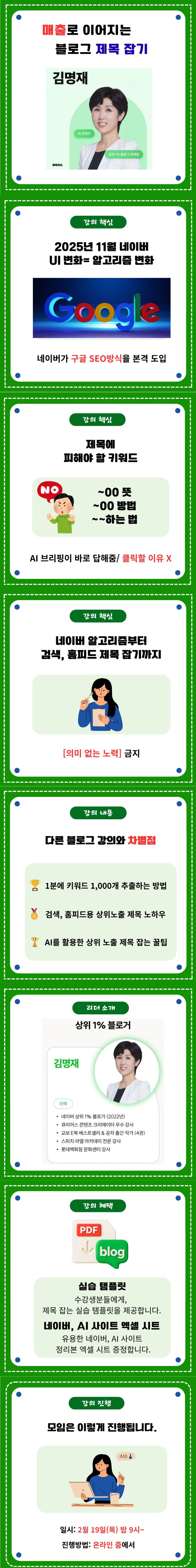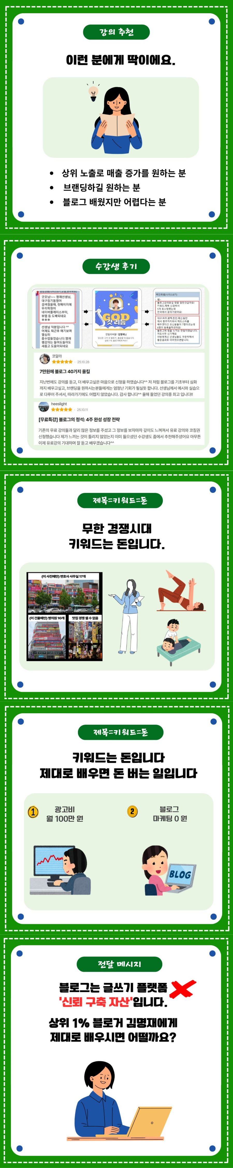 1. 기본 정보 * 생년 월일: 1974년 4월생 * 전문 분야: 블로그 코칭, 스피치 교육, 마인드 코칭 2. 핵심 성과 * 네이버 상위 1% 블로거 달성 * 교보 문고 베스트셀러 작가 & 4권 출간 공저 작가 * 큐리어스 콘텐츠 크리에이터 4기 우수 강사 선정 * 스피치 아카데미 라엘 전문 강사 3. 보유 자격증 * 블로그 마케팅 실전 전문가 * AI 콘텐츠 전문가 * 스피치 1급 지도사 * 디지털 튜터 1급 & 2급 자격증 * 성인 진로 지도사 4. 주요 활동 * 블로그 코칭 -> 콘텐츠 기획 & 작성법 교육, 수익화, 기록을 통한 브랜딩 * 교육 플랫폼 강사 활동 -> 큐리어스 우수 강사, 스피치 교육 * 작가 활동 -> 4권 출간(공저), 교보 문고 E북 에세이 베스트셀러 * 마돈나 오픈 채팅방 운영자 -> '마지막에 돈 내는 나'로 살고 싶은 사람들의 모임 5. 자기 소개 삶의 방향을 제시하는 김명재입니다. "인생은 속도가 아닌 방향이다" 라는 철학으로 블로그 코칭 전문가,기록 디자이너, 4권의 책을 출간한 작가로 많은 분들의 성장과 변화를 돕고 있습니다. * 블로그의 정석 사업 홍보 및 브랜딩이 되기 위해 가장 중요한 것은 키워드입니다. 돈이 되는 키워드에 대한 올바른 관점으로 상위 노출 제목 잡기, 글쓰기를 알려드립니다. 저품질이 되지 않기 위해 가장 필요한 것은 블로그에 대한 기본 지식을 탄탄히 쌓고, 스킬을 익히는 것이며, 좋은 양질의 글을 꾸준히 발행하는 것이죠. 그 노하우를 4주 과정을 통해 아낌없이 나누며, 함께 성장하고 수익화까지 돕겠습니다. * 검증된 콘텐츠 창작 능력. 4권의 다양한 장르 도서를 공저로 출간했습니다. 그 중 [마음에 길을 묻다]는 교보 문고 E북 에세이 베스트셀러에 오르는 성과를 거두었어요. 이러한 실전 경험을 바탕으로 단순한 이론이 아닌 실제 결과를 만드는 콘텐츠 교육을 제공합니다. * 협업과 네트워킹의 전문가. 모든 저서가 공저 작품인 만큼, 다양한 작가들과의 성공적인 협업 경험을 보유하고 있습니다. 이는 개인 창작자들의 네트워킹과 협업 기회 창출에도 도움을 드릴 수 있는 차별화된 강점입니다. * 블로그 운영과 개인 브랜딩에 모든 노하우를 수강생들과 함께 공유하고 성장하겠습니다. 감사합니다.