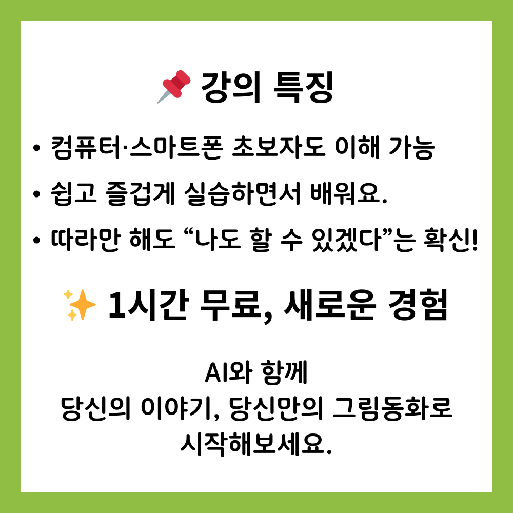 창작자로서의 성취감과 생성형 AI 활용 능력을 함께 익히실 수 있습니다.