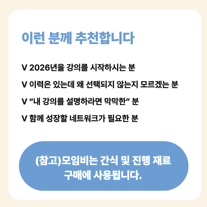강사 활동 초기 단계에 계신 분들께 현실적인 도움을 드리는 것을 목표로 합니다.