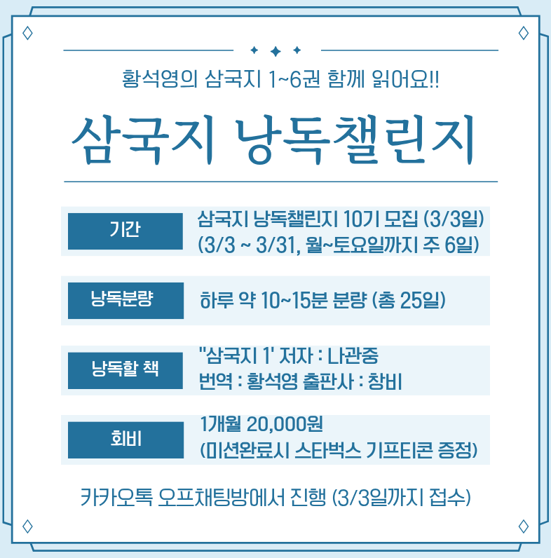 3월 삼국지 낭독챌린지 10기 모집 (3/3일 시작)