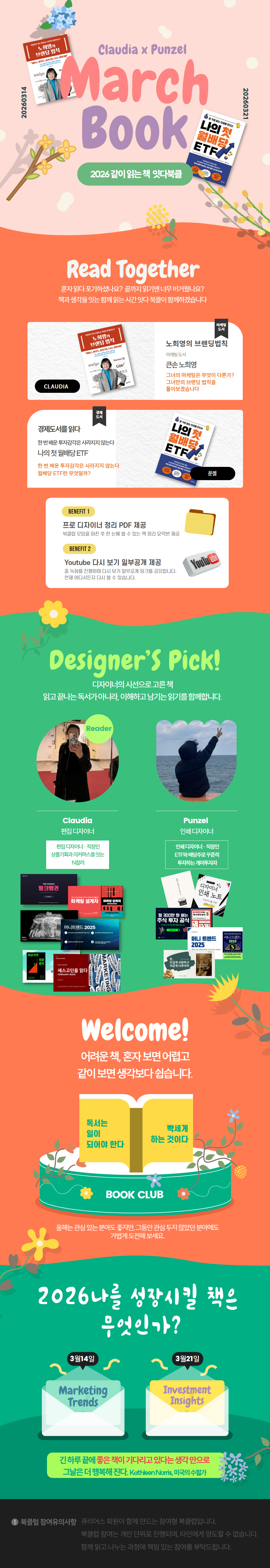 안녕하세요! 클라우디아/Claudia_letter입니다~! 🌿 잇다북클럽 리더 | 현역 디자이너 📚 『퇴근 후 일상, 글 그림일기』 무엇이든 읽고, 정리하고, 흐름을 전합니다 마케팅 · 트렌드 · 경제 삶의 기록 ✍🏻 브런치스토리 작가 현직 편집디자이너이자 마케팅·이커머스 기획자로 일하며, 트렌드와 소비의 흐름을 현장에서 경험하고 있습니다. 현장에서 마주하는 변화와 문제를 이해하기 위해 읽는 책으로 나누고 있습니다. 마케팅·트렌드·경제 도서를 통해 지금 시장이 어디로 흐르고 있는지 점검합니다 함께 읽는 책의 힘을 믿기에, 읽은 내용을 정리하고 나누는 일을 이어가고 있습니다. 오늘도 나에게 필요한 읽기를 선택하며, 책과 현장을 잇는 기록을 이어갑니다.