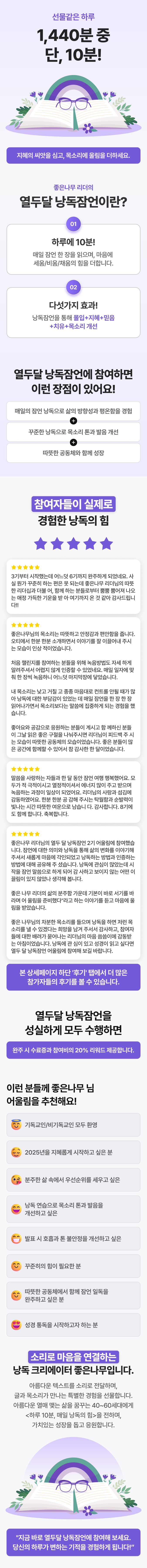 안녕하세요. 소리로 마음을 연결하는 낭독 크리에이터, 좋은나무입니다. 아름다운 텍스트를 목소리로 전달하며, 책과 소리, 그리고 마음을 연결하는 특별한 경험을 만들어가고 있습니다. ‘열두달 낭독여행’은 하루 5분의 낭독을 통해 지혜와 언어, 마음과 리더십, 그리고 건강을 세워가는 행복한 여정입니다. 신뢰와 공감, 연결을 바탕으로 40~60대의 삶 속에서 가치 있는 성장과 선한 영향력을 이루도록 돕는 낭독 기반의 성숙한 공동체를 지향합니다. 각자의 목소리가 하나의 선율이 되어 세상을 따뜻하게 변화시키는 여정에 함께하길 소망합니다. 🌿 23.12~ 열두달낭독잠언 14기 운영 🌿 25.02~ 열두달낭독시편 10기 운영 🌿 25.12 열두달낭독가든_버리기 잘한 습관들 🌿 26.01~ 열두달낭독성경_좋은나무와 함께하는 100독의 시작 .