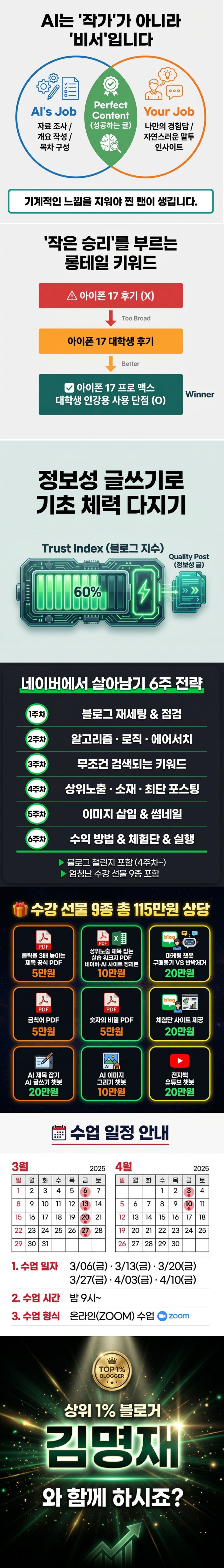 1. 기본 정보 * 생년 월일: 1974년 4월생 * 전문 분야: 블로그 코칭, 스피치 교육, 마인드 코칭 2. 핵심 성과 * 네이버 상위 1% 블로거 달성 * 교보 문고 베스트셀러 작가 & 4권 출간 공저 작가 * 큐리어스 콘텐츠 크리에이터 4기 우수 강사 선정 * 스피치 아카데미 라엘 전문 강사 3. 보유 자격증 * 블로그 마케팅 실전 전문가 * AI 콘텐츠 전문가 * 스피치 1급 지도사 * 디지털 튜터 1급 & 2급 자격증 * 성인 진로 지도사 4. 주요 활동 * 블로그 코칭 -> 콘텐츠 기획 & 작성법 교육, 수익화, 기록을 통한 브랜딩 * 교육 플랫폼 강사 활동 -> 큐리어스 우수 강사, 스피치 교육 * 작가 활동 -> 4권 출간(공저), 교보 문고 E북 에세이 베스트셀러 * 마돈나 오픈 채팅방 운영자 -> '마지막에 돈 내는 나'로 살고 싶은 사람들의 모임 5. 자기 소개 삶의 방향을 제시하는 김명재입니다. "인생은 속도가 아닌 방향이다" 라는 철학으로 블로그 코칭 전문가,기록 디자이너, 4권의 책을 출간한 작가로 많은 분들의 성장과 변화를 돕고 있습니다. * 블로그의 정석 사업 홍보 및 브랜딩이 되기 위해 가장 중요한 것은 키워드입니다. 돈이 되는 키워드에 대한 올바른 관점으로 상위 노출 제목 잡기, 글쓰기를 알려드립니다. 저품질이 되지 않기 위해 가장 필요한 것은 블로그에 대한 기본 지식을 탄탄히 쌓고, 스킬을 익히는 것이며, 좋은 양질의 글을 꾸준히 발행하는 것이죠. 그 노하우를 4주 과정을 통해 아낌없이 나누며, 함께 성장하고 수익화까지 돕겠습니다. * 검증된 콘텐츠 창작 능력. 4권의 다양한 장르 도서를 공저로 출간했습니다. 그 중 [마음에 길을 묻다]는 교보 문고 E북 에세이 베스트셀러에 오르는 성과를 거두었어요. 이러한 실전 경험을 바탕으로 단순한 이론이 아닌 실제 결과를 만드는 콘텐츠 교육을 제공합니다. * 협업과 네트워킹의 전문가. 모든 저서가 공저 작품인 만큼, 다양한 작가들과의 성공적인 협업 경험을 보유하고 있습니다. 이는 개인 창작자들의 네트워킹과 협업 기회 창출에도 도움을 드릴 수 있는 차별화된 강점입니다. * 블로그 운영과 개인 브랜딩에 모든 노하우를 수강생들과 함께 공유하고 성장하겠습니다. 감사합니다.