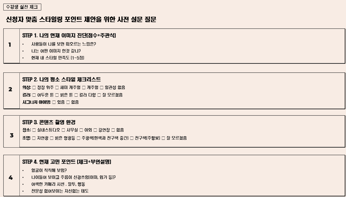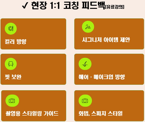 ▶ 현장 피드백 제공 _ 퍼스널 컬러 방향 / 핏 보완 / 시그니처 아이템 제안 / 헤어·메이크업 방향 / 촬영용 스타일링 가이드