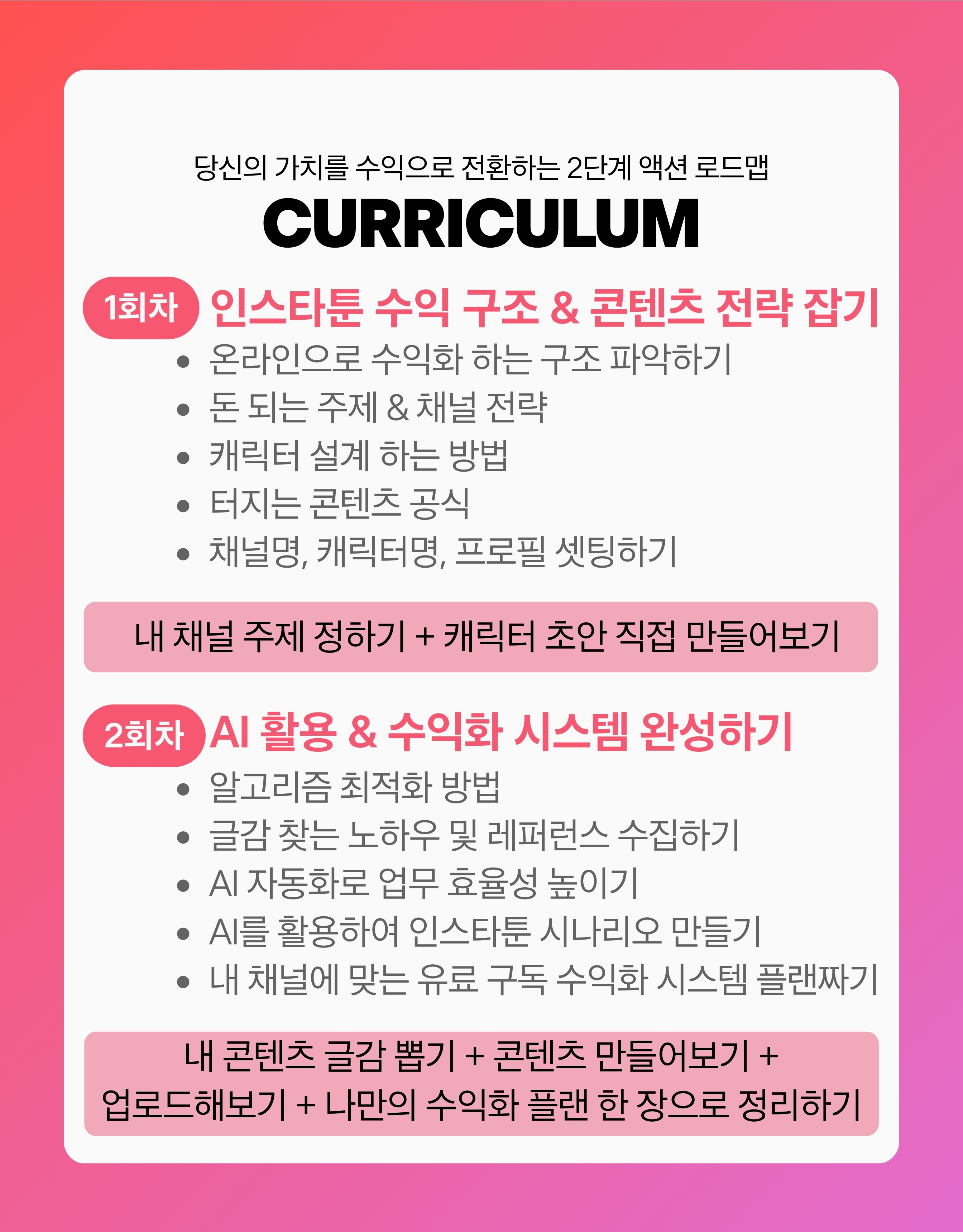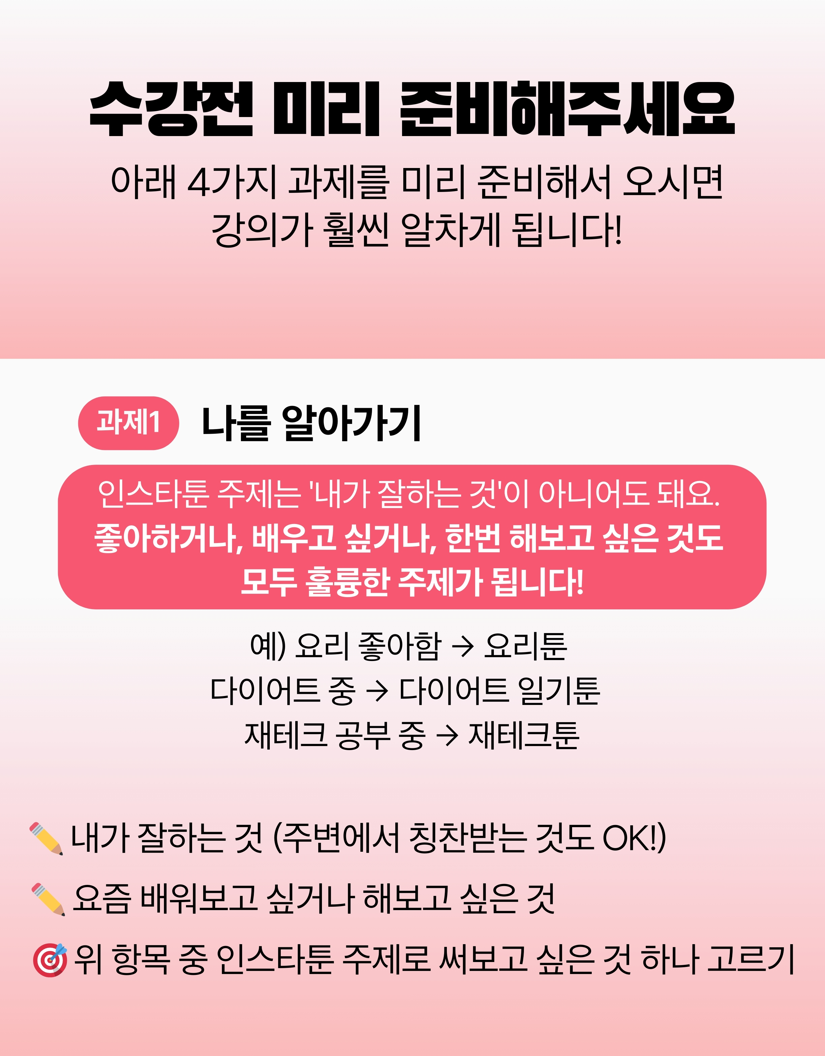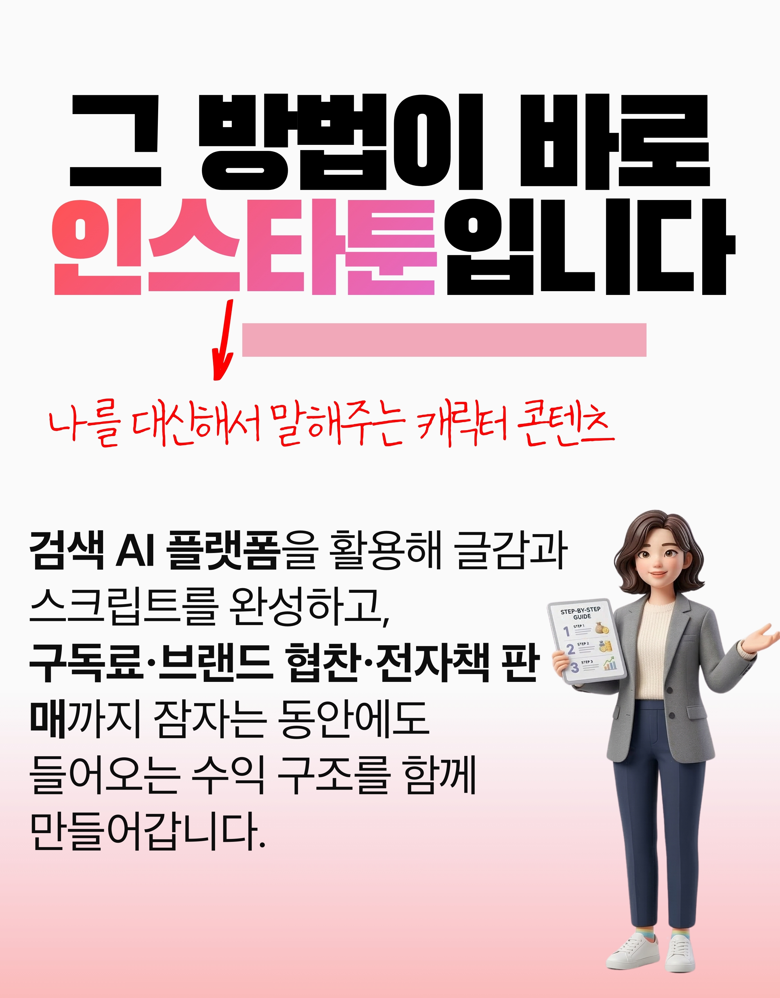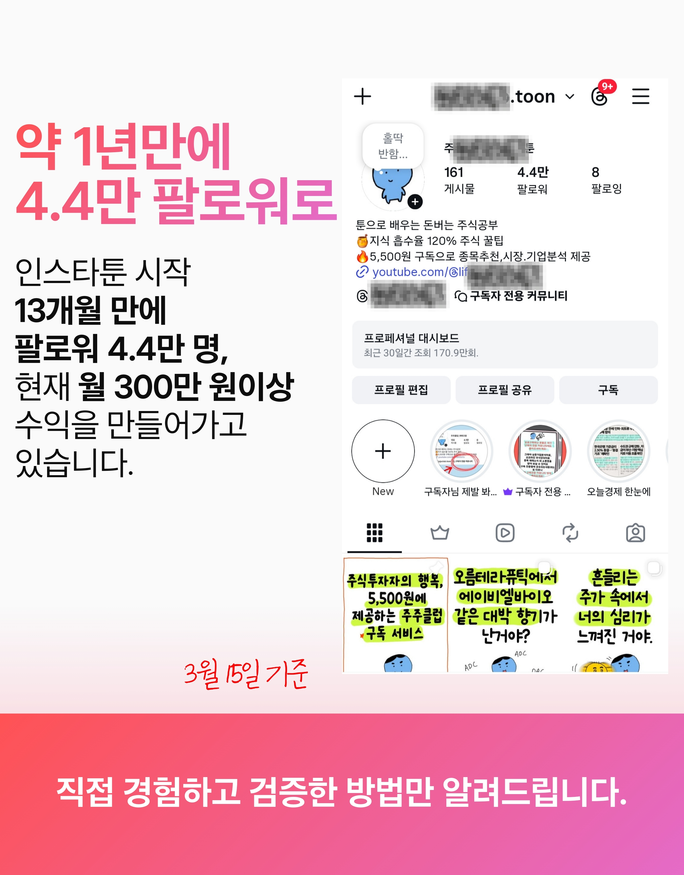 안녕하세요! 저는 현재 4.4만명과 함께하는 인스타툰 운영자입니다. 4.4만 팔로워를 모으고 강의를 열기까지 제가 직접 겪은 시행착오와 성공 방정식을 모두 공개합니다. '완벽'보다는 '완성'을 목표로 여러분의 첫 번째 인스타툰이 세상에 나올 수 있도록 가장 확실한 가이드를 약속합니다.