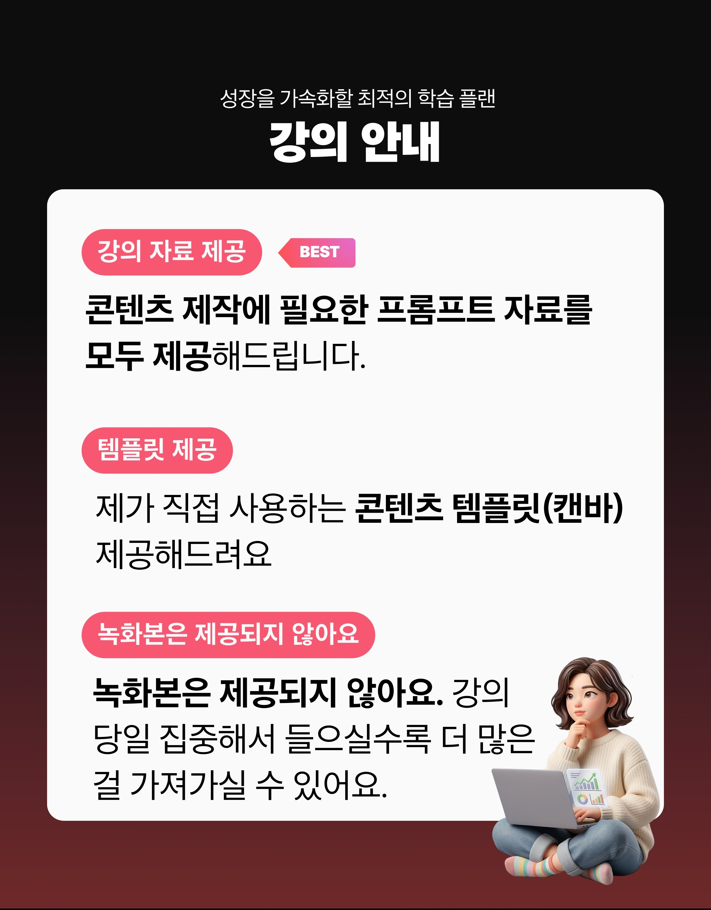 - 환불이 불가능하다고 사전에 명시된 주요 콘텐츠(강의 영상, 실습 자료 등)가 제공된 경우 * 단순한 안내문, 일정표 등의 자료 제공만으로는 환불 불가 사유가 되지 않습니다.