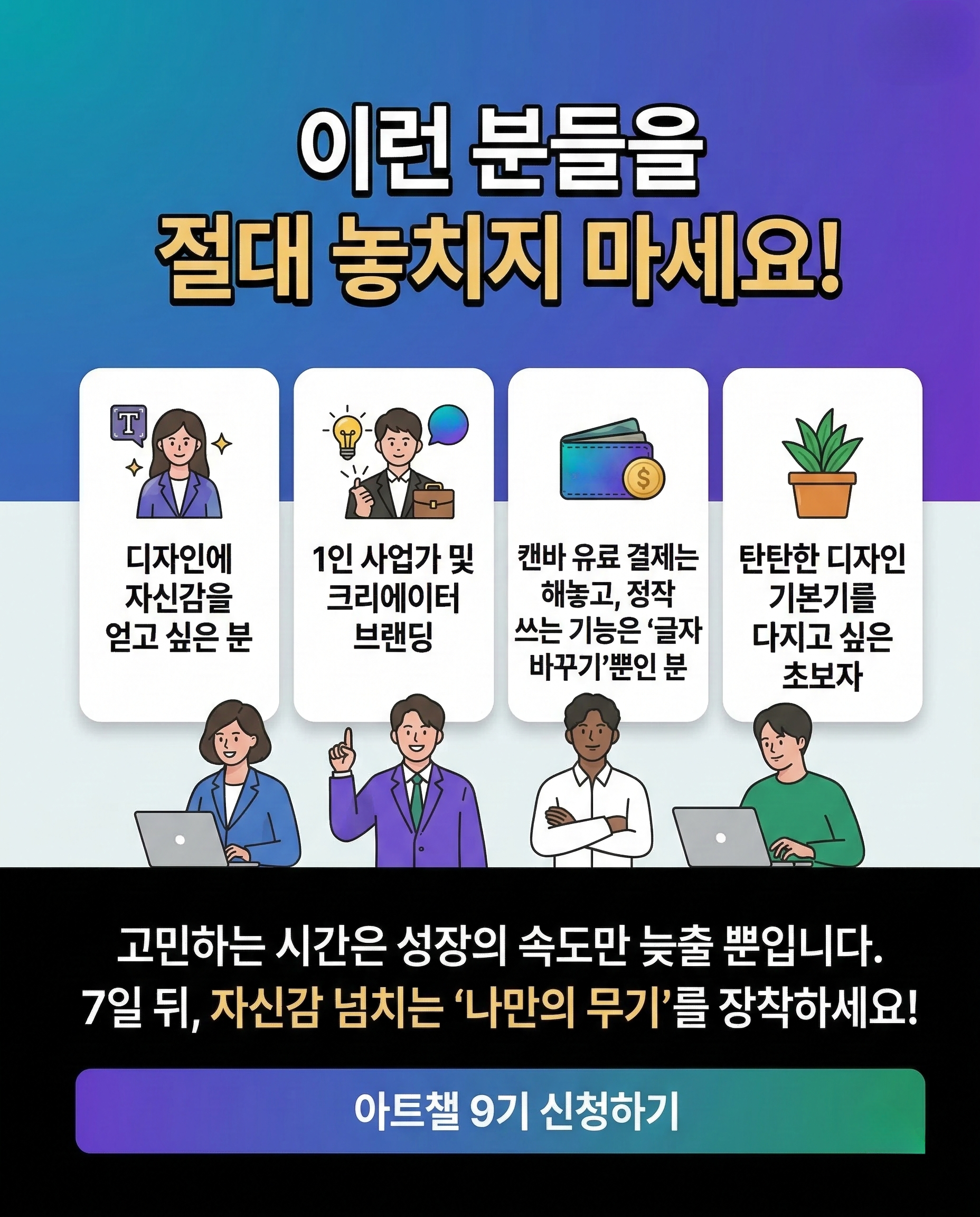안녕하세요! 아트하라입니다~! 캔바를 알리고 가르치는 어울림 리더로 활동중입니다. 설계 디자이너로 활동하며 우연한 기회에 캔바를 알게 되었고 그 매력에 빠져 이 자리까지 오게 되었습니다. 여러분과 함께 소통하면서 디자인의 기초부터 고급 기술까지 배워보는 시간을 가지고 싶습니다. 여러분의 창의력을 발휘할 수 있도록 돕겠습니다.