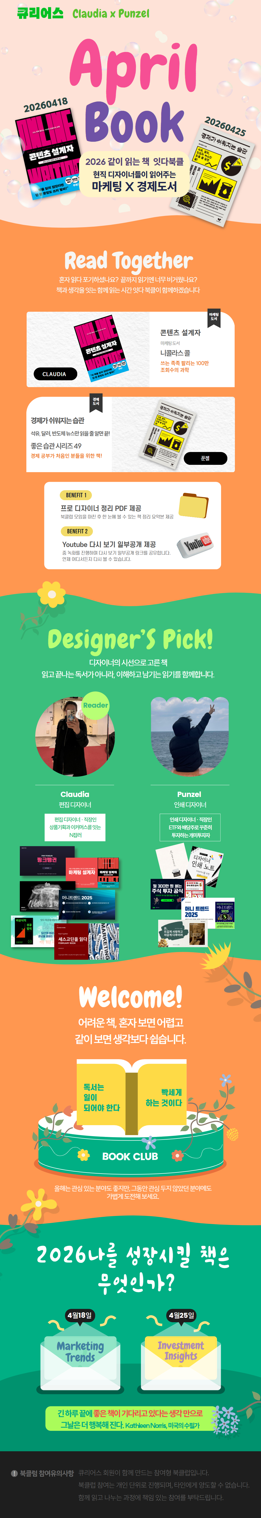 안녕하세요! 클라우디아/Claudia_letter입니다~! 🌿 잇다북클럽 리더 | 현역 디자이너 📚 『퇴근 후 일상, 글 그림일기』 무엇이든 읽고, 정리하고, 흐름을 전합니다 마케팅 · 트렌드 · 경제 삶의 기록 ✍🏻 브런치스토리 작가 현직 편집디자이너이자 마케팅·이커머스 기획자로 일하며, 트렌드와 소비의 흐름을 현장에서 경험하고 있습니다. 현장에서 마주하는 변화와 문제를 이해하기 위해 읽는 책으로 나누고 있습니다. 마케팅·트렌드·경제 도서를 통해 지금 시장이 어디로 흐르고 있는지 점검합니다 함께 읽는 책의 힘을 믿기에, 읽은 내용을 정리하고 나누는 일을 이어가고 있습니다. 오늘도 나에게 필요한 읽기를 선택하며, 책과 현장을 잇는 기록을 이어갑니다.