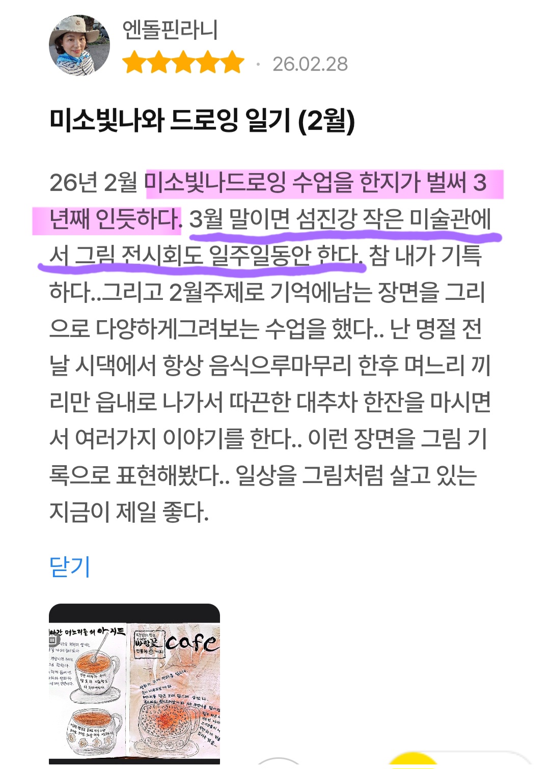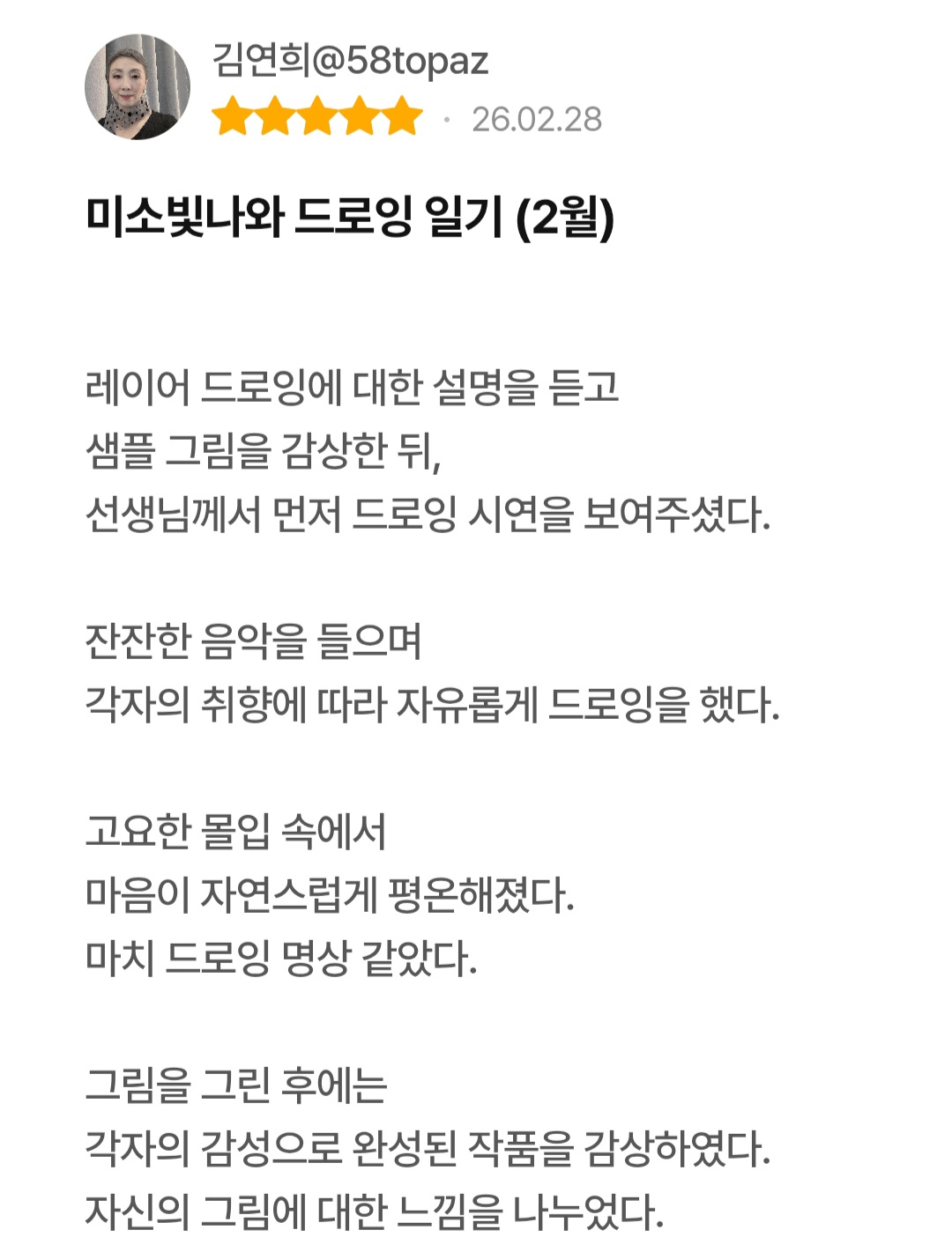 📙삶을 예술로 빛나게 돕는 미소빛나입니다. 🎨모든 순간이 예술이 되는 삶, 🖌나만의 소중한 경험을 그림으로 풀어내며 회복과 성장을 함께 나누고 있습니다. 나답게 살아가는 힘을, 예술을 통해 여러분과 함께 나누고 싶습니다. 🙏그림을 처음 시작하는 여러분, 걱정하지 마세요! 모든 시작이 그렇듯, 처음엔 어색하고 어렵게 느껴질 수 있지만, 한 걸음씩 나아가다 보면 그 자체로 즐거움이 생기고 자신감을 얻을 수 있습니다. 드로잉 일기는 완벽함을 추구하는 것이 아니라, 여러분만의 감정과 생각을 자유롭게 표현하는 시간이에요. 실수도, 부족함도 다 괜찮습니다. 그 모든 과정이 여러분만의 특별한 여정이니까요. 여러분의 그림은 이미 충분히 아름답고, 그 자체로 값지답니다.