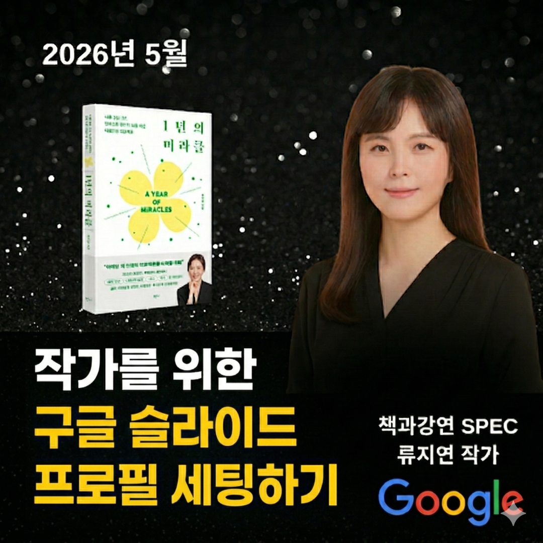 나는 어떤 작가인가요. AI 시대, 이 질문은 더 이상 글로만 답하지 않습니다. 보여주는 구조로 답해야 합니다. 『1년의 미라클』 저자, 업무 효율화 프로세스 디자이너 · 구글 공인 트레이너 류지연입니다. 이 강연은 슬라이드를 잘 만드는 강의가 아닙니다. 작가의 기회를 만드는 구조를 설계하는 강의입니다.