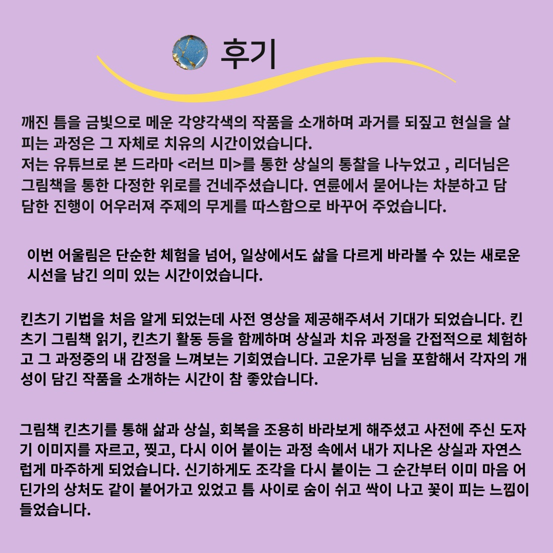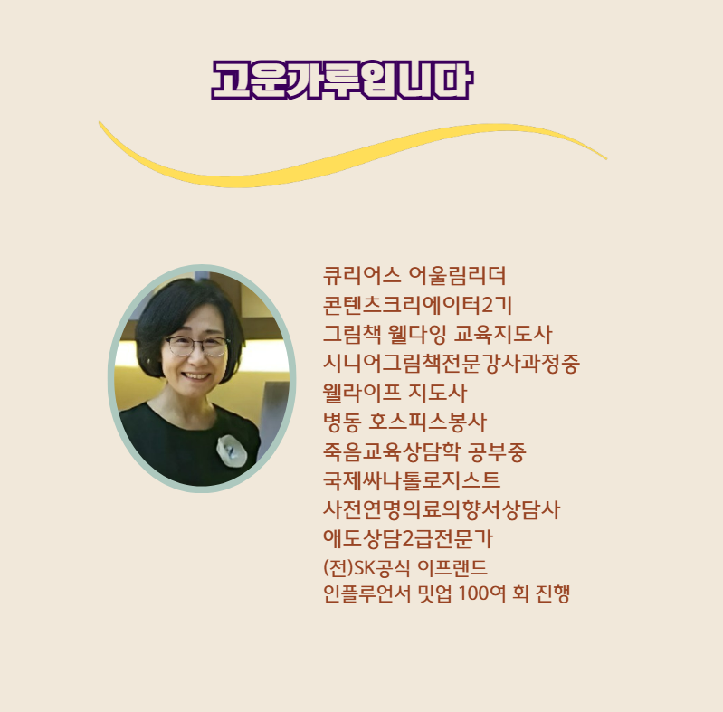 살아가면서 만나는 상실의 크고 작은 순간들을 그림책으로 풀어내는 크리에이터 고운가루입니다. 우리가 마주하는 이별과 상실의 순간들을 섬세한 시선으로 바라보며, 그림책을 통해 삶의 소중함과 깊이 있는 통찰을 함께 나누고 싶습니다. * 큐리어스 어울림리더 * 콘텐츠크리에이터2기 * 웰다잉그림책 교육지도사 * 웰라이프 지도사 * 애도 상담 전문가2급 *죽음교육전문가2급 * 국제싸나톨로지스트 * 죽음교육상담석사과정 * 제10회 죽음학.죽음교육 학술대회 발표 * 어린이도서연구회회원 * 사회복지사2급 * 병동 호스피스 봉사 * 자살예방전문강사