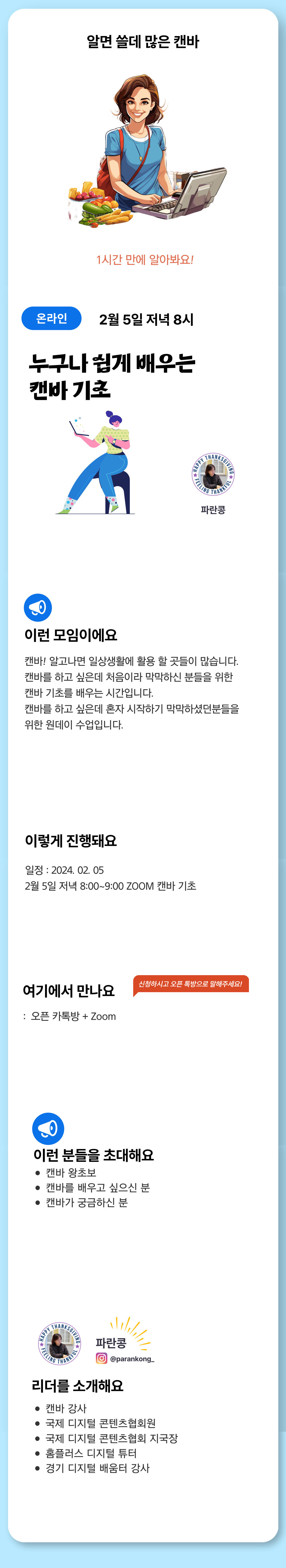 캔바! 알고나면 일상생활에 활용 할 곳들이 많습니다. 캔바를 하고 싶은데 처음이라 막막하신 분들을 위한 캔바 기초를 배우는 시간입니다. 캔바를 하고 싶은데 혼자 시작하기 막막하셨던분들을 위한 원데이 수업입니다.