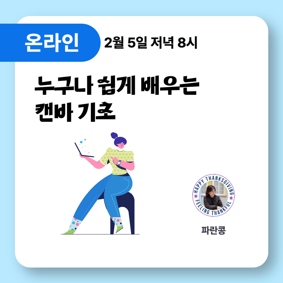 안녕하세요. 디지털 배움터와 홈플러스 다양한 커뮤니티에서 디지털강사로 활동하고 있는 파란콩입니다. 캔바를 통해 다양한 사람들에게 도움을 드리고자 합니다. 캔바의 다양한 기능과 도구 사용법을 효율적인 강의로 수강하는분들과 소통하며 캔바를 보다 효과적으로 활용하는 법을 알려드리고 있습니다.