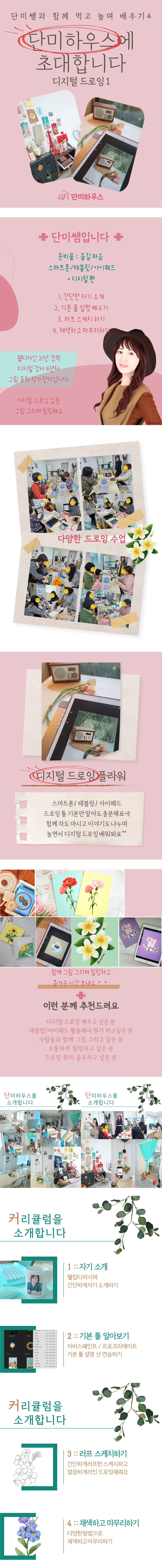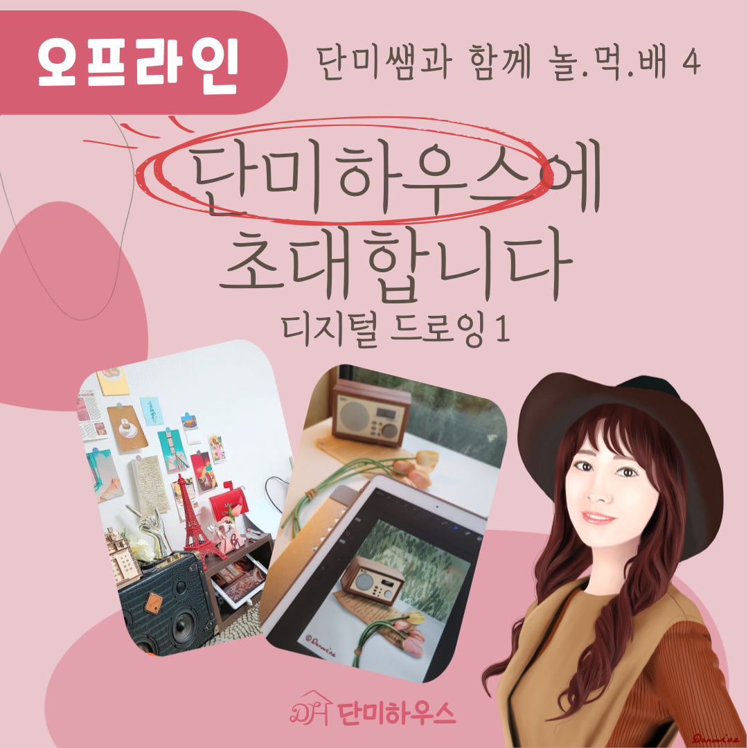 어울림 소개 💐안녕하세요💐 단미하우스의 단미쌤입니다💜 2024년 2월부터 단미하우스 사무실을 오픈 하고 있어요. 네 번째 오프라인 어울림이에요 ^^ 3월에는 디지털 드로잉~!! 처음 하시는 분들도 직접 만나서 배우면 더 빠르게 그릴 수 있어요. 다양한 주제로 어울림 오픈 예정이니 많은 관심 부탁드려요 ^^ 편하게 차 마시고 얘기 나누며 디지털 드로잉도 배워봐요~ 📷단미쌤 드로잉 경력📷 초중고 만화창작부 시간 강사 경력 아이애니학원 강사 활동 전 아동복 캐릭터 디자인 활동 전 백화점여성의류브랜드에서 프린트 디자인 디지털 배움터에서 디지털 강사로 4년 활동 2023.6 전자동화책 '단미하우스에 사는 다다와 하루' 출간 & 굿즈 제작 현 가죽 공방에서 캘리/드로잉 및 웹작업중 큐리어스 작년 11월부터 드로잉 수업중 🐈⬛단미하우스 스토어 운영중🐈⬛ 전자책/스티커/엽서/패브릭포스터/액자/머그컵 등 제작하고 있어요