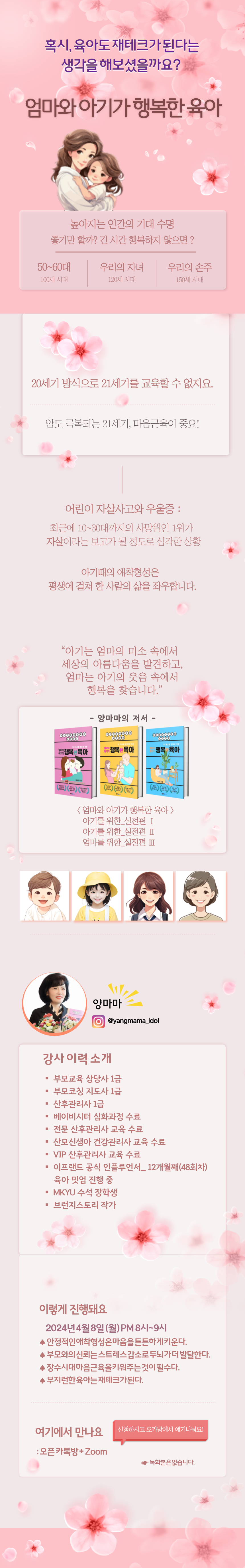안녕하세요! 양마마(채성희)입니다~! 저는 <엄마와 아기가 행복한 육아>-실전편Ⅰ,Ⅱ,Ⅲ 의 저자이자 이프랜드 공식 육아 인플루언서로 활동하고 있습니다. 양마마의 육아 경험과 전문성 ‣ 두 아들을 영재로 키워낸 노하우를 가지고 있고, ‣ 다년간 산모·신생아 건강관리사로 일하면서 많은 경험을 쌓았으며, ‣ 육아에 대한 다양한 꿀팁과 실전 경험을 가지고 있습니다. 양마마의 육아 철학과 목표 ‣ 육아의 첫 단추를 잘 끼우는 것이 '평생 육아'에 매우 중요하다는 것과 ‣ '육아도 아는 만큼 쉬워진다'는 철학을 가지고 있고, ‣ 부모님들께 육아에 대한 자신감을 심어주고 싶으며, ‣ 육아의 고충을 공감해주고 경험과 노하우를 공유하고자 합니다. 양마마의 활동 ‣ 매주 육아 관련 내용으로 이프랜드에서 밋업을 진행(50회차) 했으며, ‣ 저서 <엄마와 아기가 행복한 육아>-실전편Ⅰ,Ⅱ,Ⅲ을 통해 육아 정보를 제공하고 있고, ‣ SNS 계정을 통해 육아 관련 정보와 노하우, 팁을 공유하고 있습니다. --------------------------------------------- ▪ 저서<엄마와 아기가 행복한 육아> 아기를 위한_실전편Ⅰ 아기를 위한_실전편Ⅱ 엄마를 위한_실전편Ⅲ ▪ 부모교육 상담사 1급 ▪ 부모코칭 지도사 1급 ▪ 산후관리사 1급 ▪ 베이비시터 일반/심화과정 수료 ▪ 전문 산후관리사 교육 수료 ▪ 산모·신생아 건강관리사 교육 수료 ▪ VIP 산후관리사 교육 수료 ▪ 이프랜드 공식 인플루언서_육아 밋업(현재-50회차) 진행 중 ▪ MKYU수석장학생 ▪ 브런치스토리 작가 ▪ 큐리어스 3~6기 서포터즈 ▪ SNS 마케팅전문가 1급 자격증 취득 ▪ 인공지능데이터전문가 2급 자격취득 ▪ 인공지능데이터전문가 1급 자격취득 ▪ 정보기술자격(ITQ) 한글엑셀 A등급 자격증 취득 ▪ 뤼튼 AI 프롬프트 스페셜리스트 자격증 취득 ▪ 뤼튼 AI 프롬프톤 지도자 자격증 취득 ▪ 모바일 디지털튜터 2급 자격증 취득